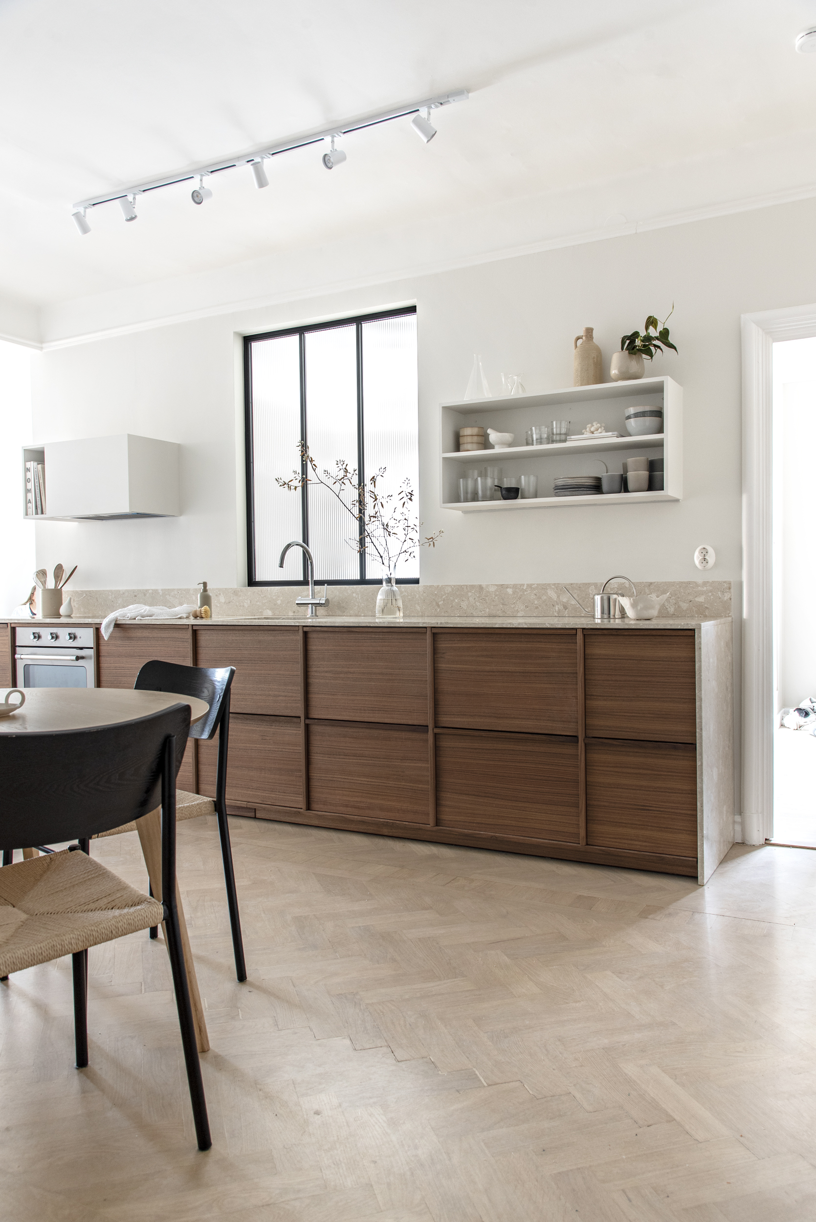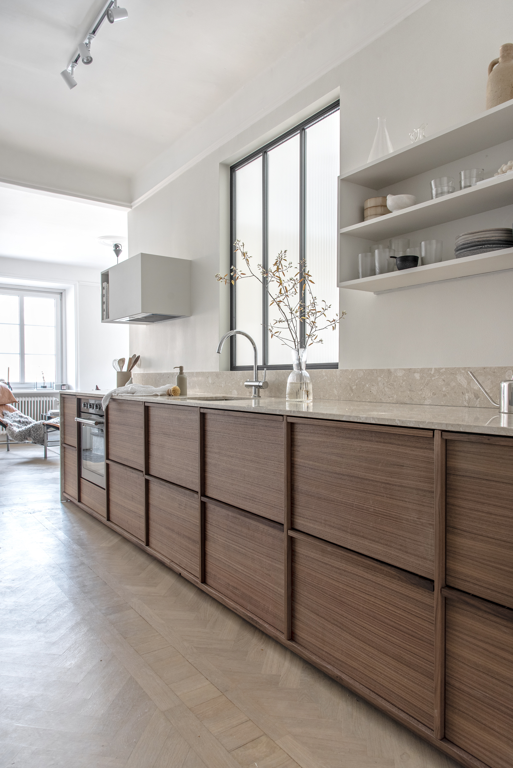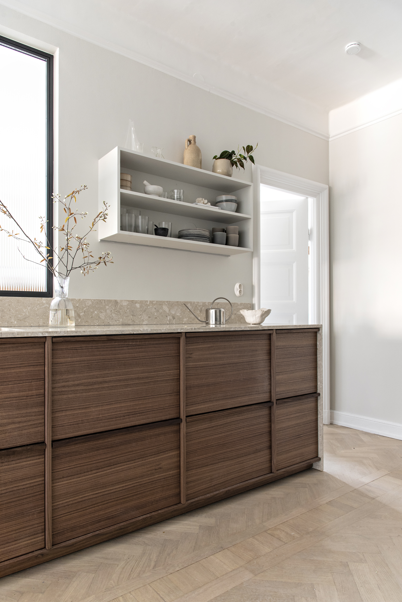 Vill du ha en liknande stil i ditt kök? Välj fanér i varianten True Walnut med grepplist samt distanslister.