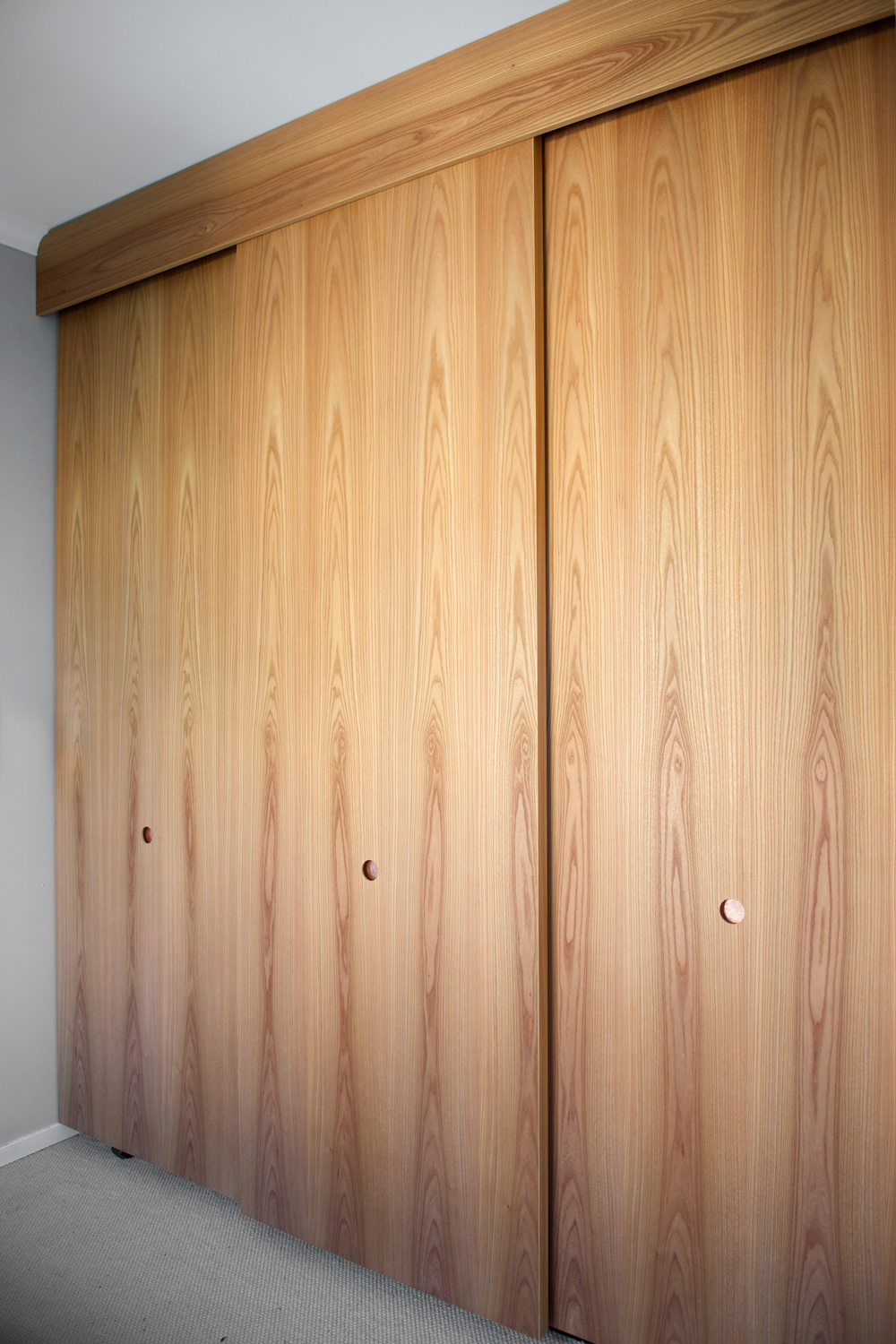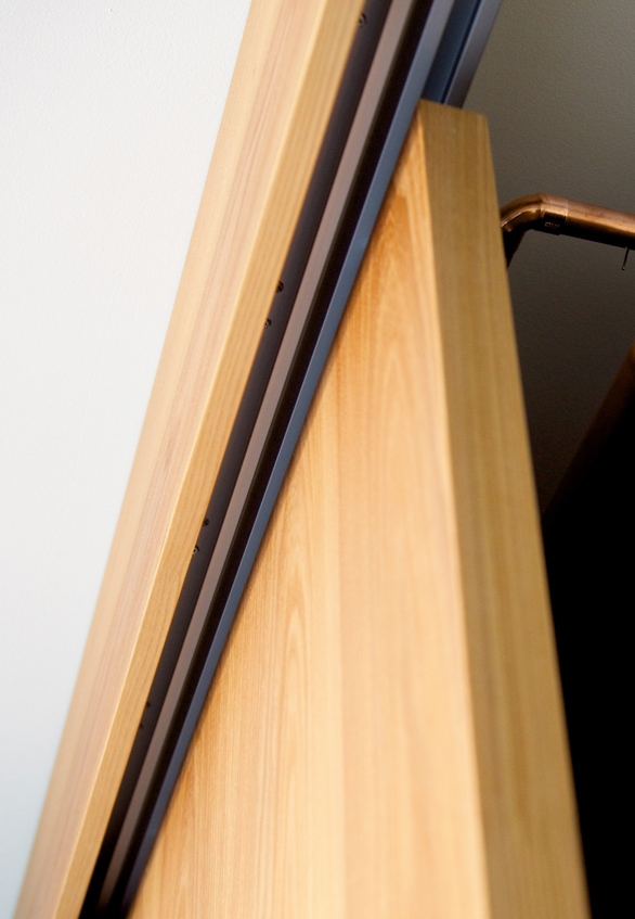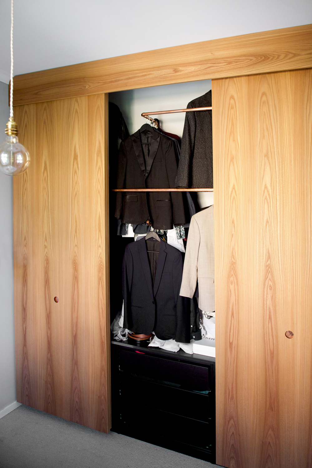 Inredningen i garderoberna är ett IKEA-hack med koppardetaljer och hyllplan i svart valchromat. Alla våra skjutdörrar är topphängda, utan skenor i golvet.