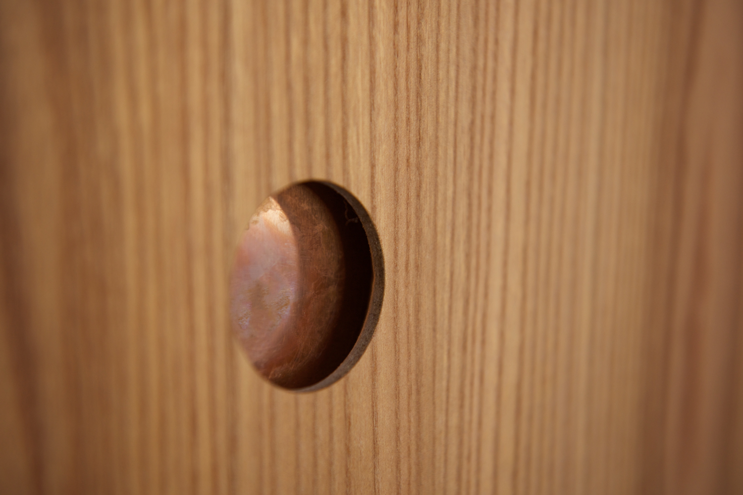 Skjutdörrarna är i modellen "True Elm" med greppen Pixie och greppbakstycke i koppar. Topptäcksidan högst upp har fått en extra nedsänkningsbox för att ta hänsyn till stuckaturen.