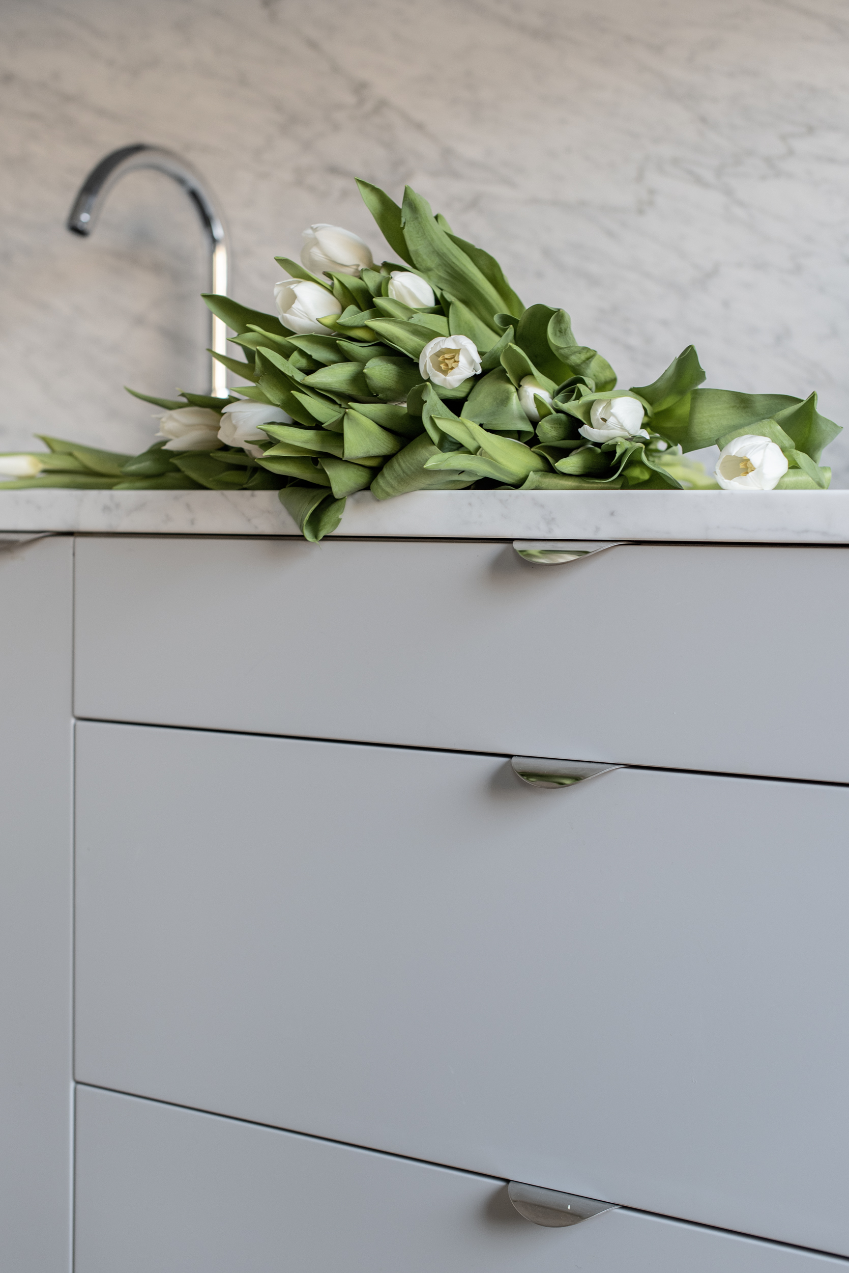 De släta luckorna går hela vägen upp till tak och den specialbeställda infräsningen möjliggör att både belysning och ventilation kan gömmas i överskåpen.