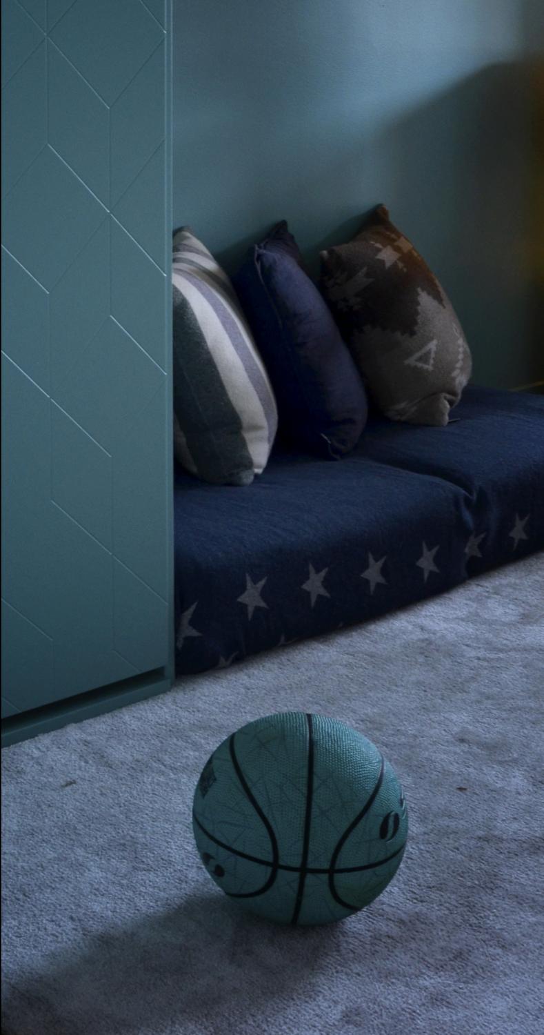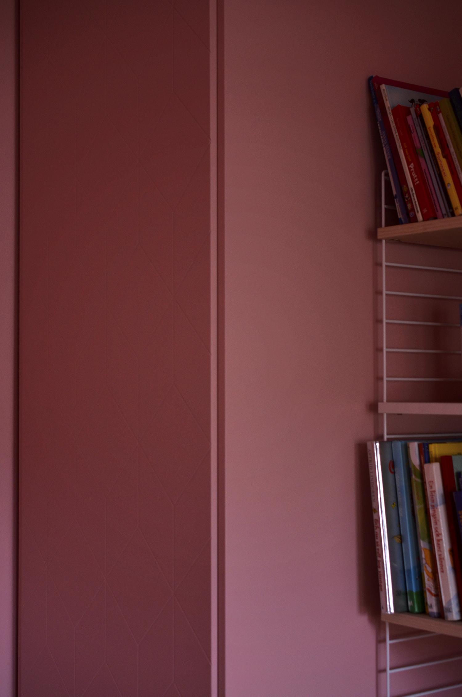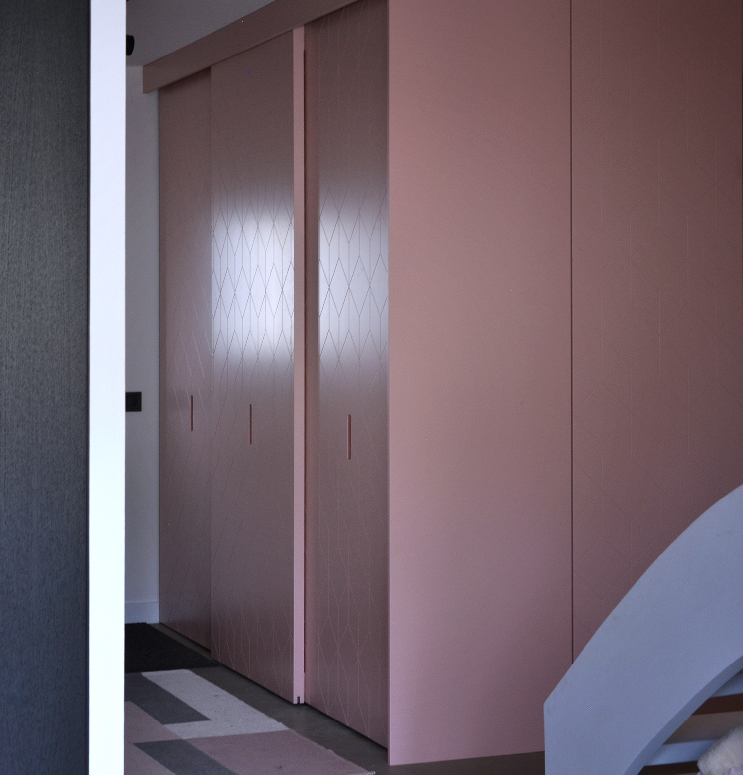 Barnrummet på Brunnsgatan har fått inklädda garderober med mönstret "Levels". Den blå färgen heter 2020-B50G och den rosa 1020-B50G. Den vänstra bilden visar en takhängd skjutdörrslösning i mönstret "Levels". Greppet på denna skjutdörr är Paula med ett greppbakstycke i mässing, något som skapar en effektfull entré i hallen.