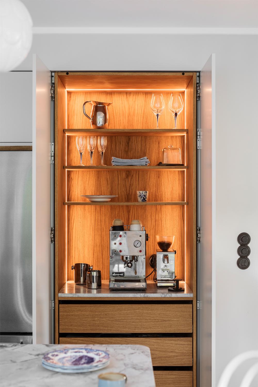 Bilderna ovan visar ett pivot skåp tillverkat i våra egna skåpsstommar. Luckorna går att fälla in vid sidorna av stommen och den integrerade belysningen är ett tillval som skapar exklusivitet i köket.