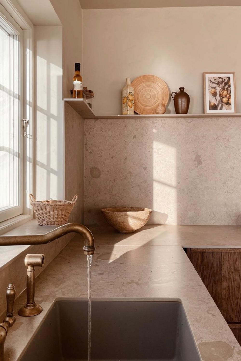 Bänkskivan "Norrvange Beige Matt" från Bricmate går upp en bit på väggen som en hylla samt nyttjas till överhäng på köksön vilket skapar möjligheter att kunna nyttja köksön som en social plats.