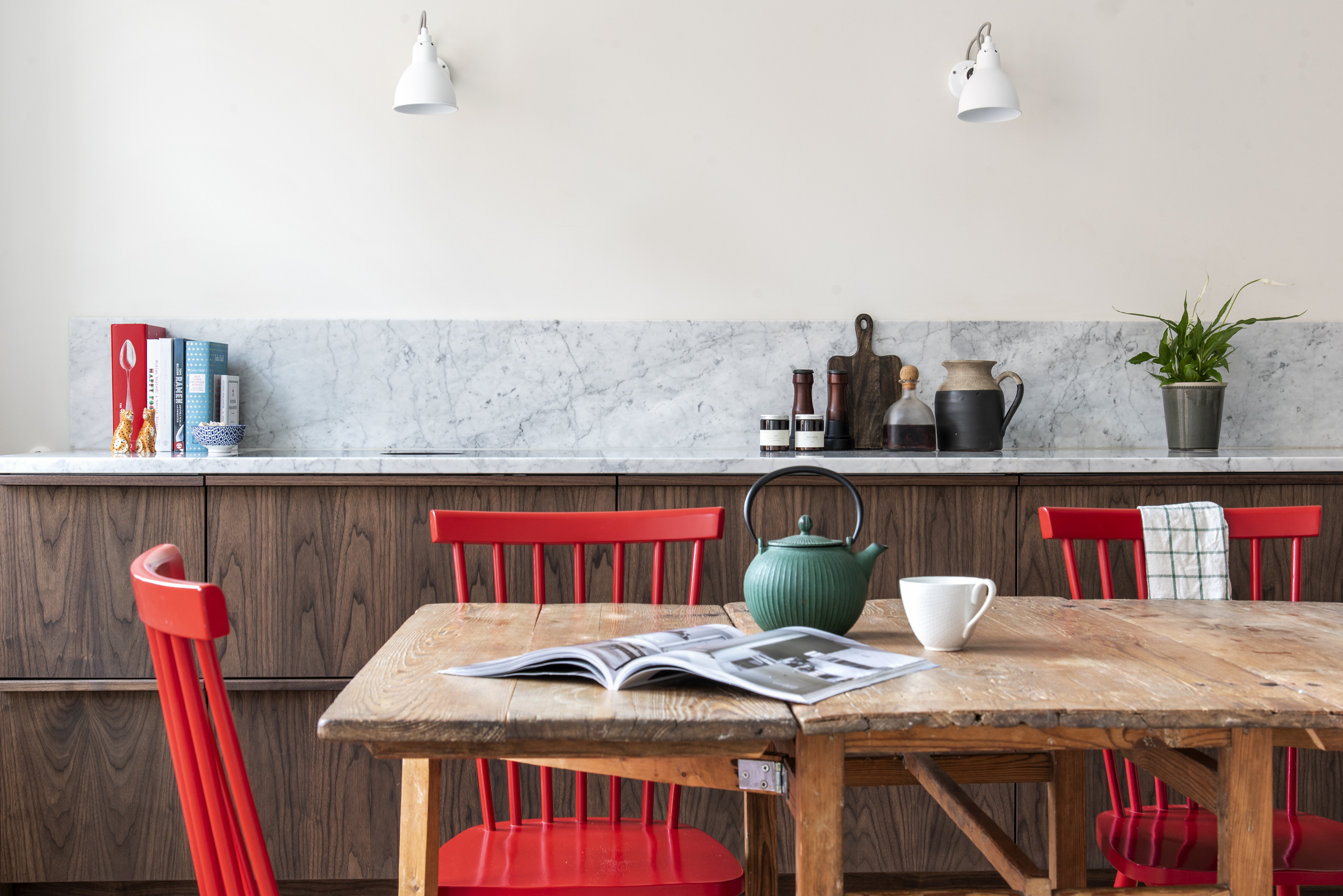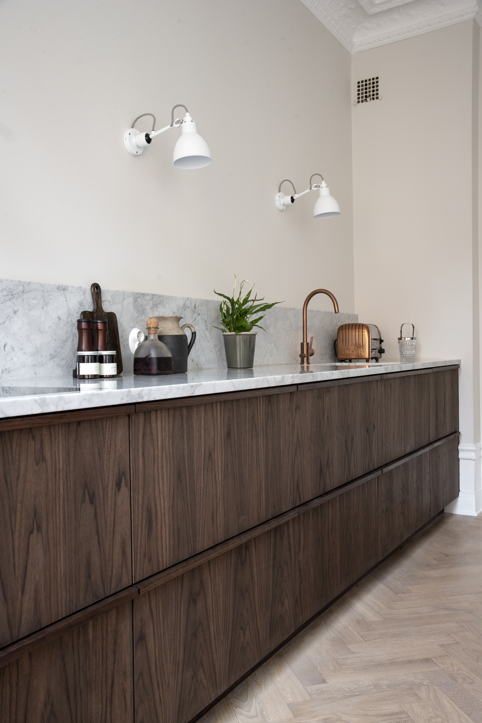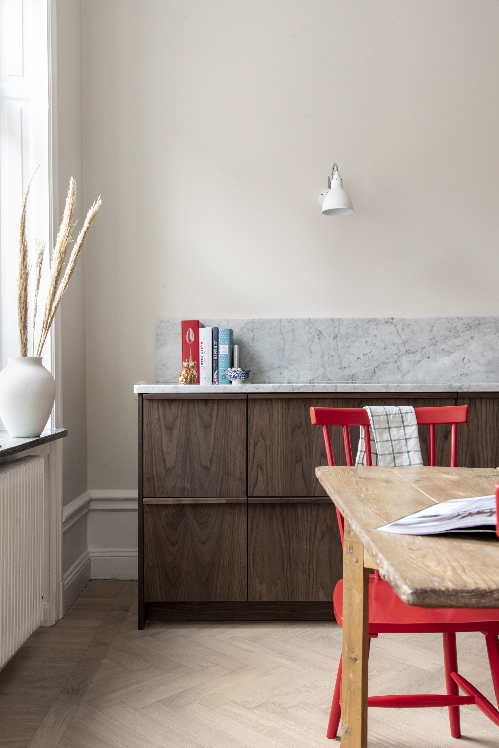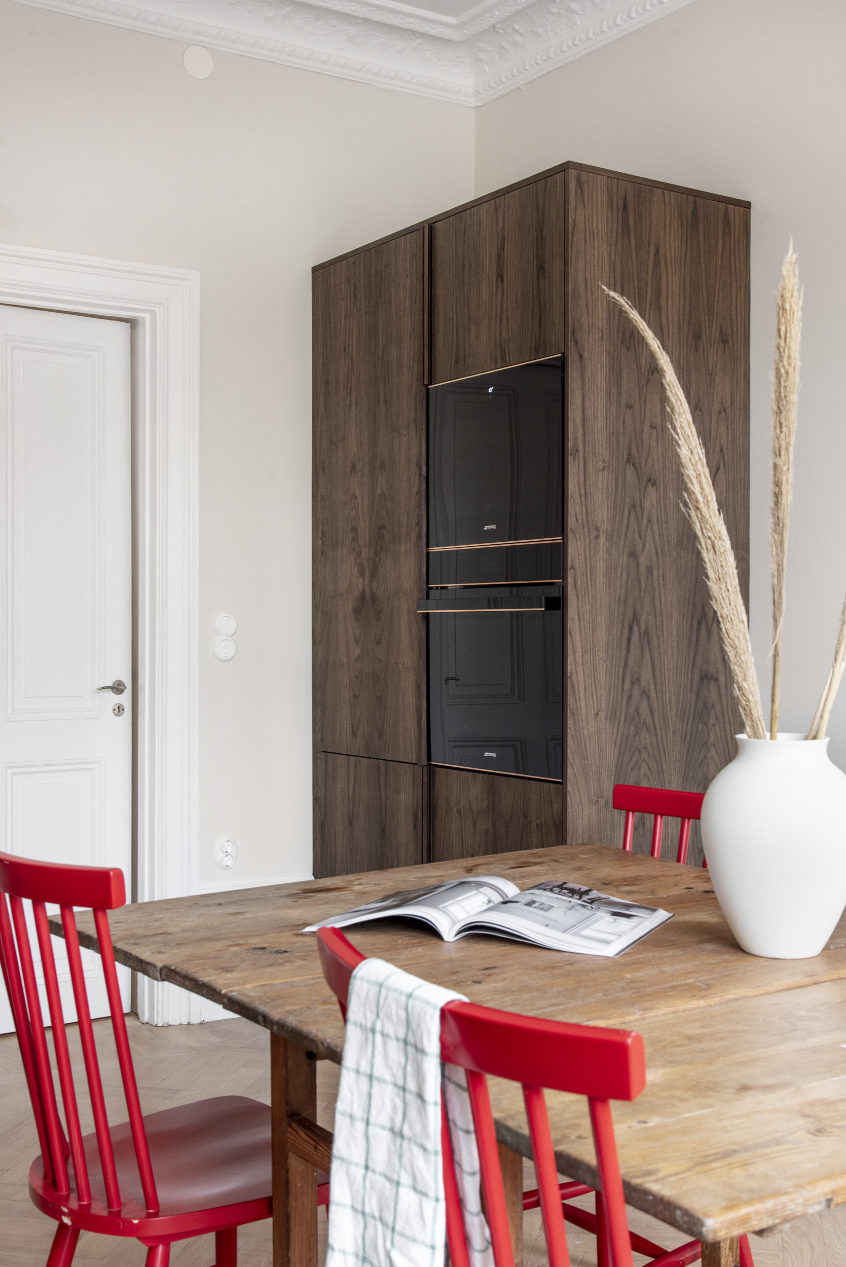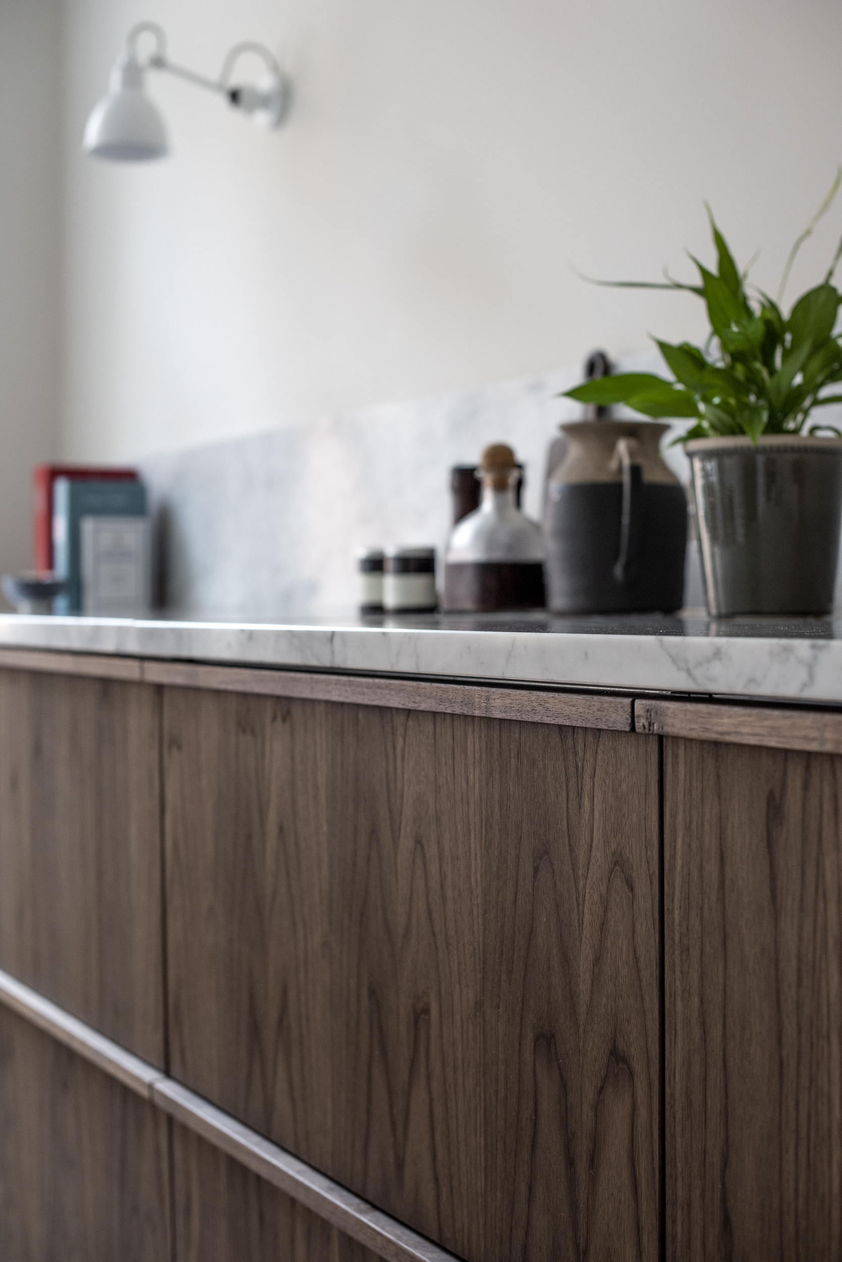 Köket på Hälsingegatan pryds av luckor och dörrar i "True Walnut" med grepplist som handtag.
