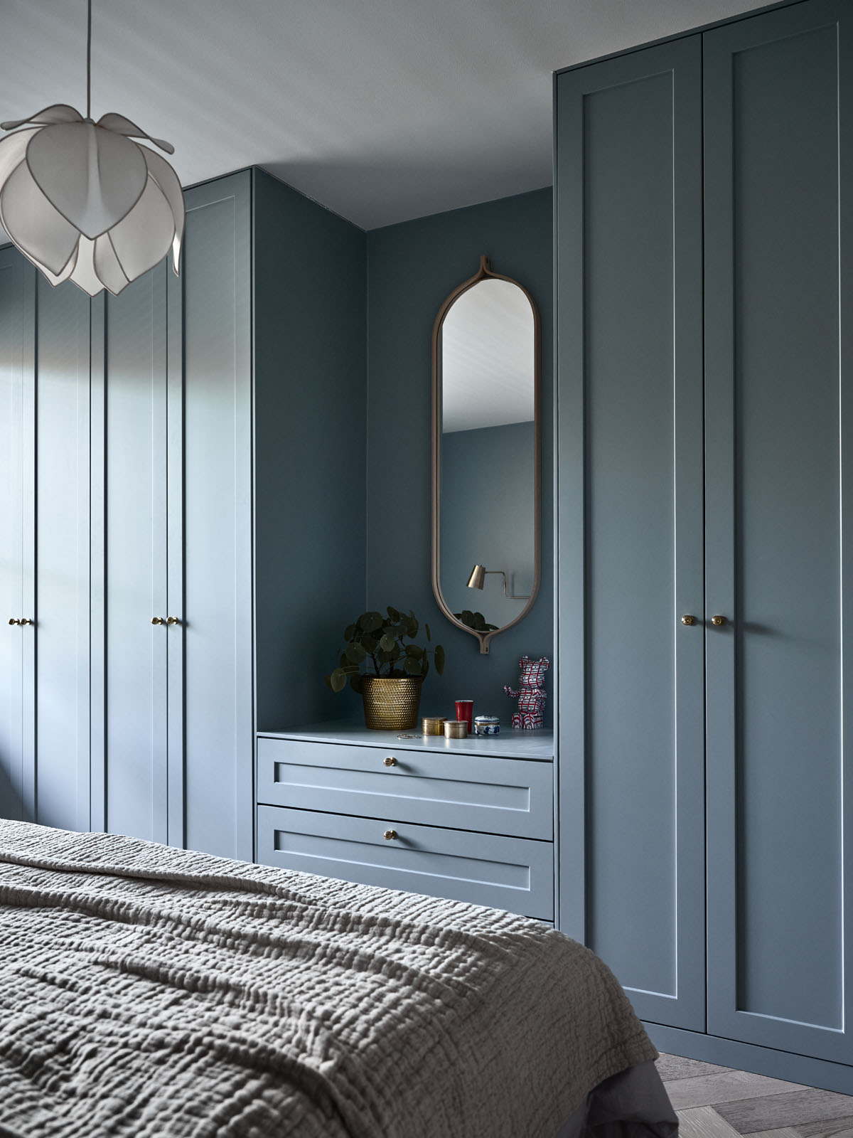 Af Kant dörrar till garderober i lägenhetens sovrum i olika härliga färger.