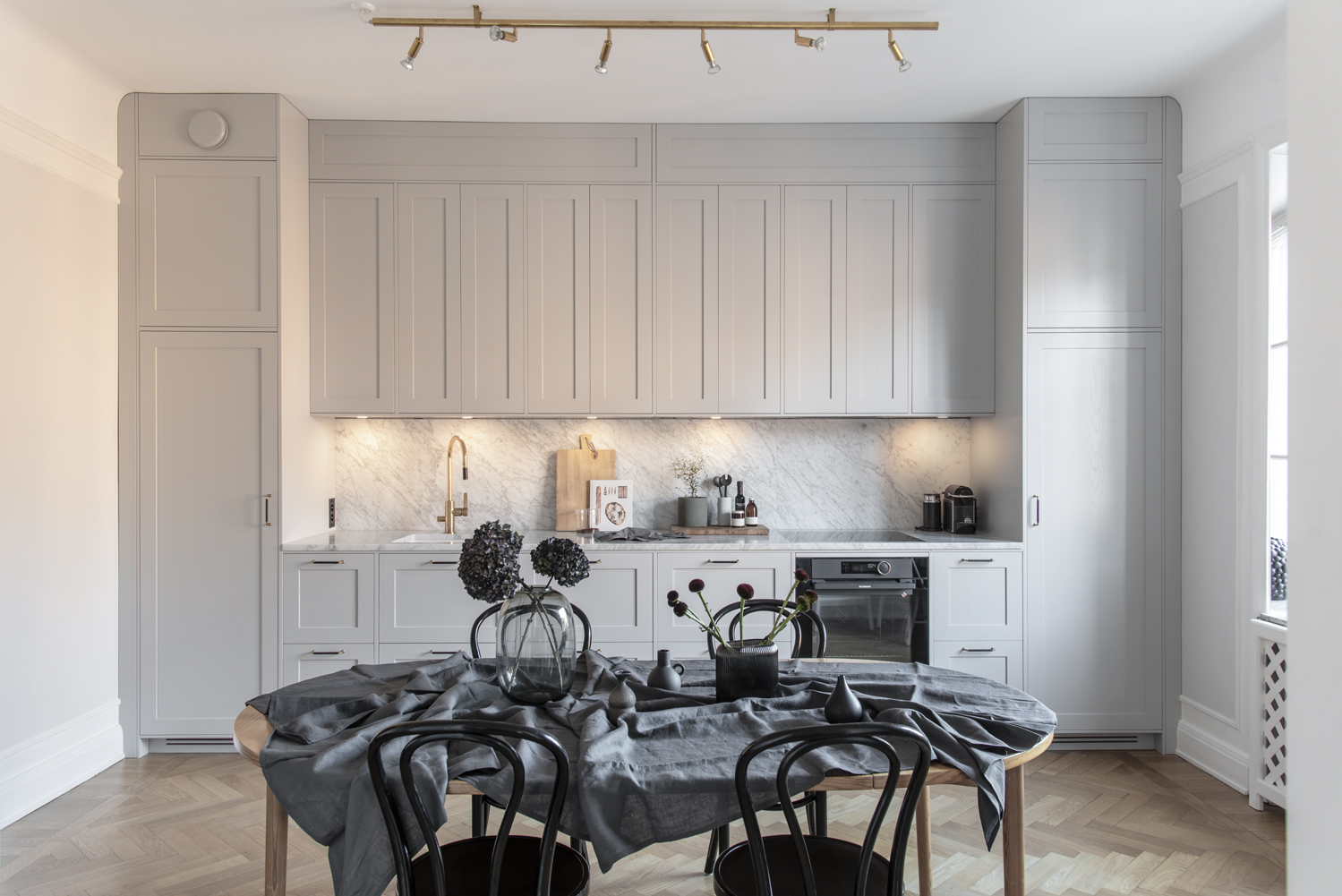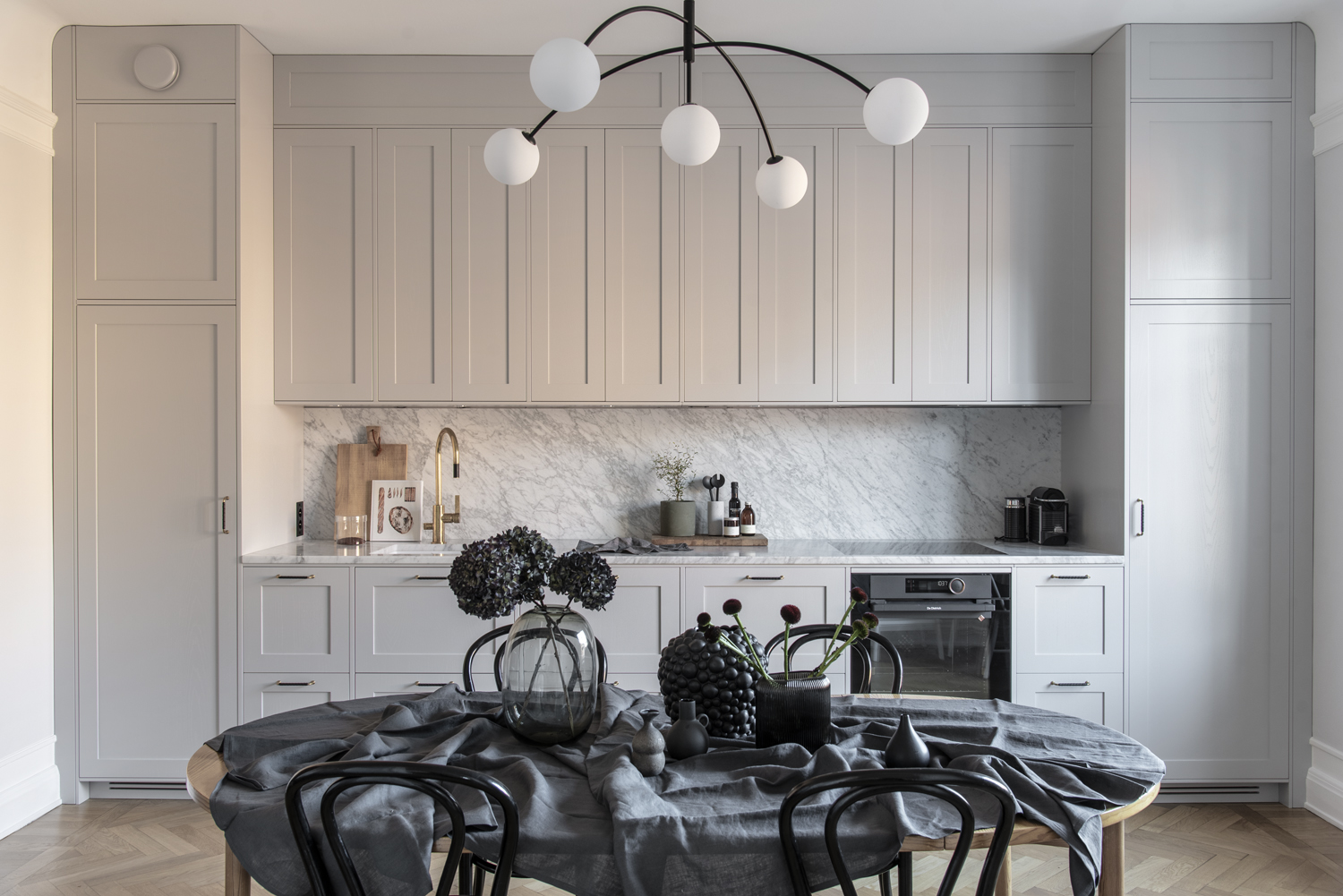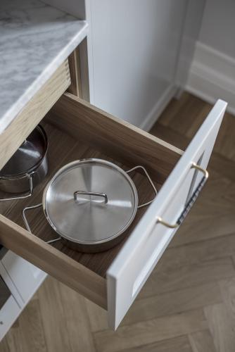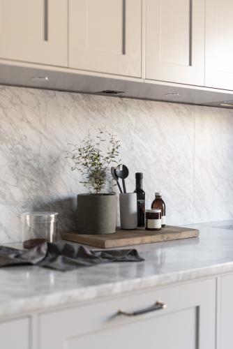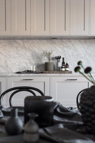 Det luftiga drömköket på Karlavägen är ritat enligt kundens önskemål och mått med stommar tillverkade av oss. Luckorna är lackade ramluckor i färgkoden 2000-N och tillverkade i askfanér i modellen Ramses. Bänkskivan är i exklusiv Carrera marmor.