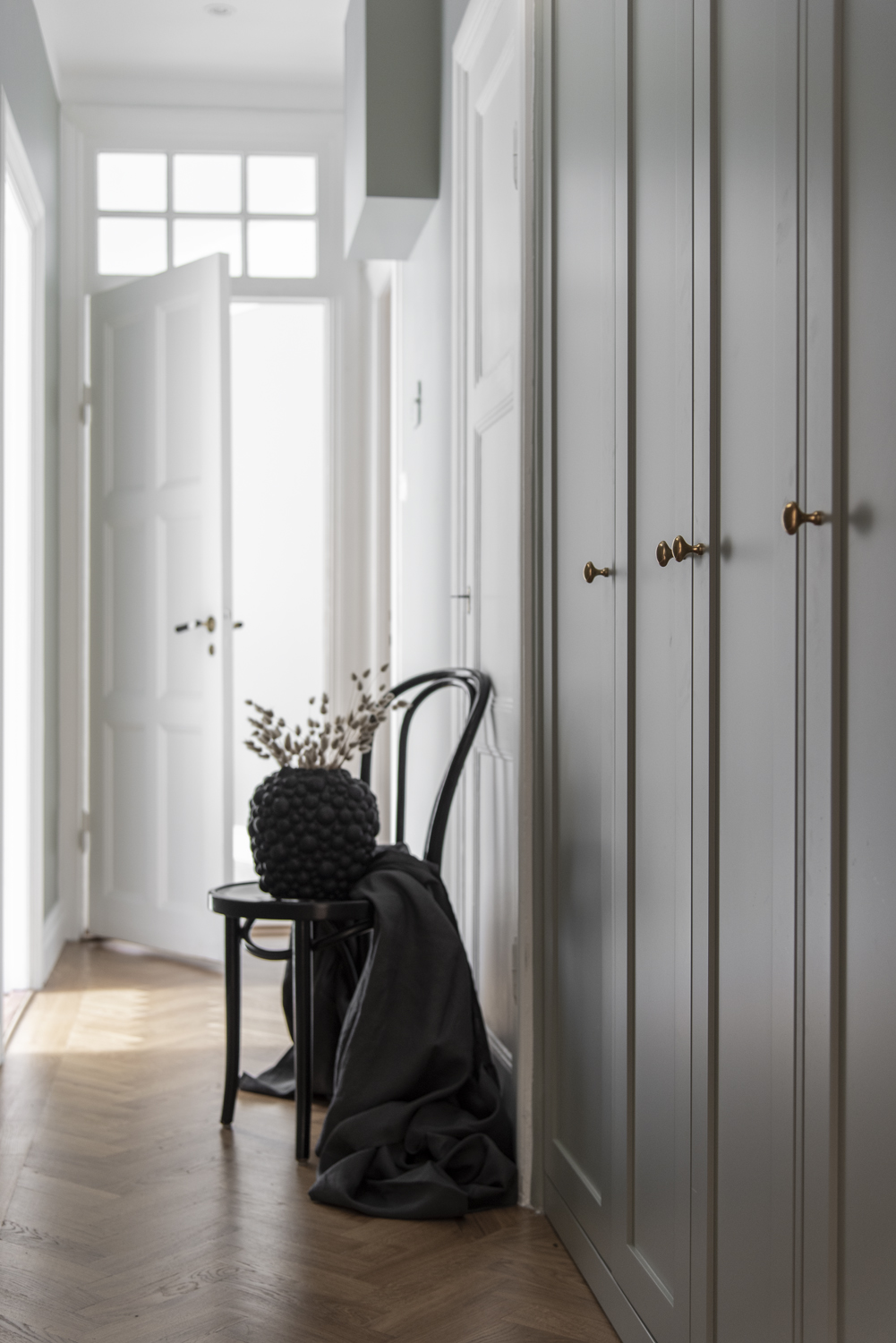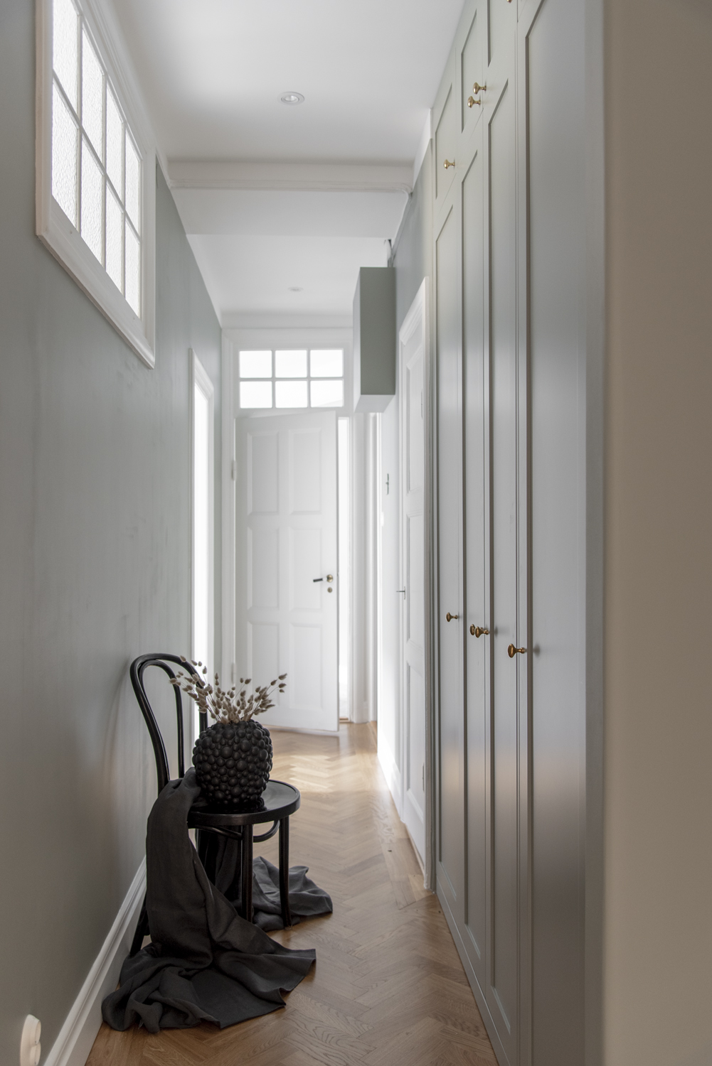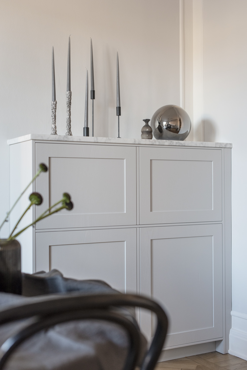 Det luftiga drömköket på Karlavägen är ritat enligt kundens önskemål och mått med stommar tillverkade av oss. Luckorna är lackade ramluckor i färgkoden 2000-N och tillverkade i askfanér i modellen Ramses. Bänkskivan är i exklusiv Carrera marmor.