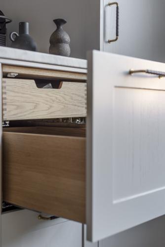 Handtag från Beslag Design inlindade i läder, eluttag från Buster & Punch och blandare i mässing från Tapwell.