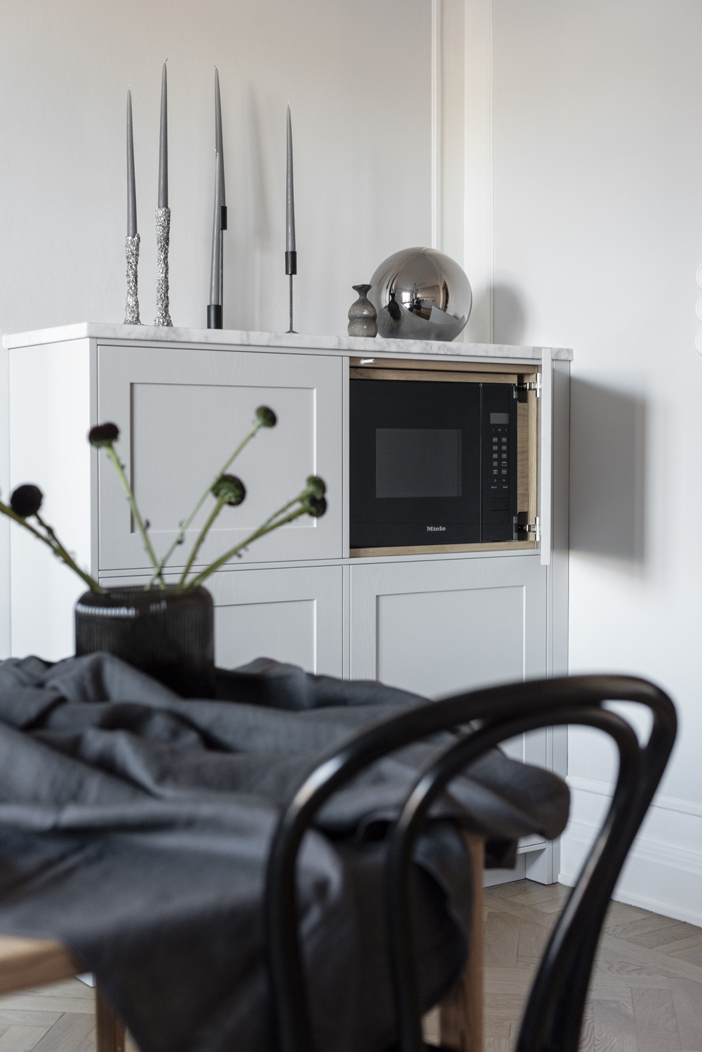 I köket finns också en specialbyggd köksmöbel som döljer microvågsugn och andra kökstillbehör elegant.