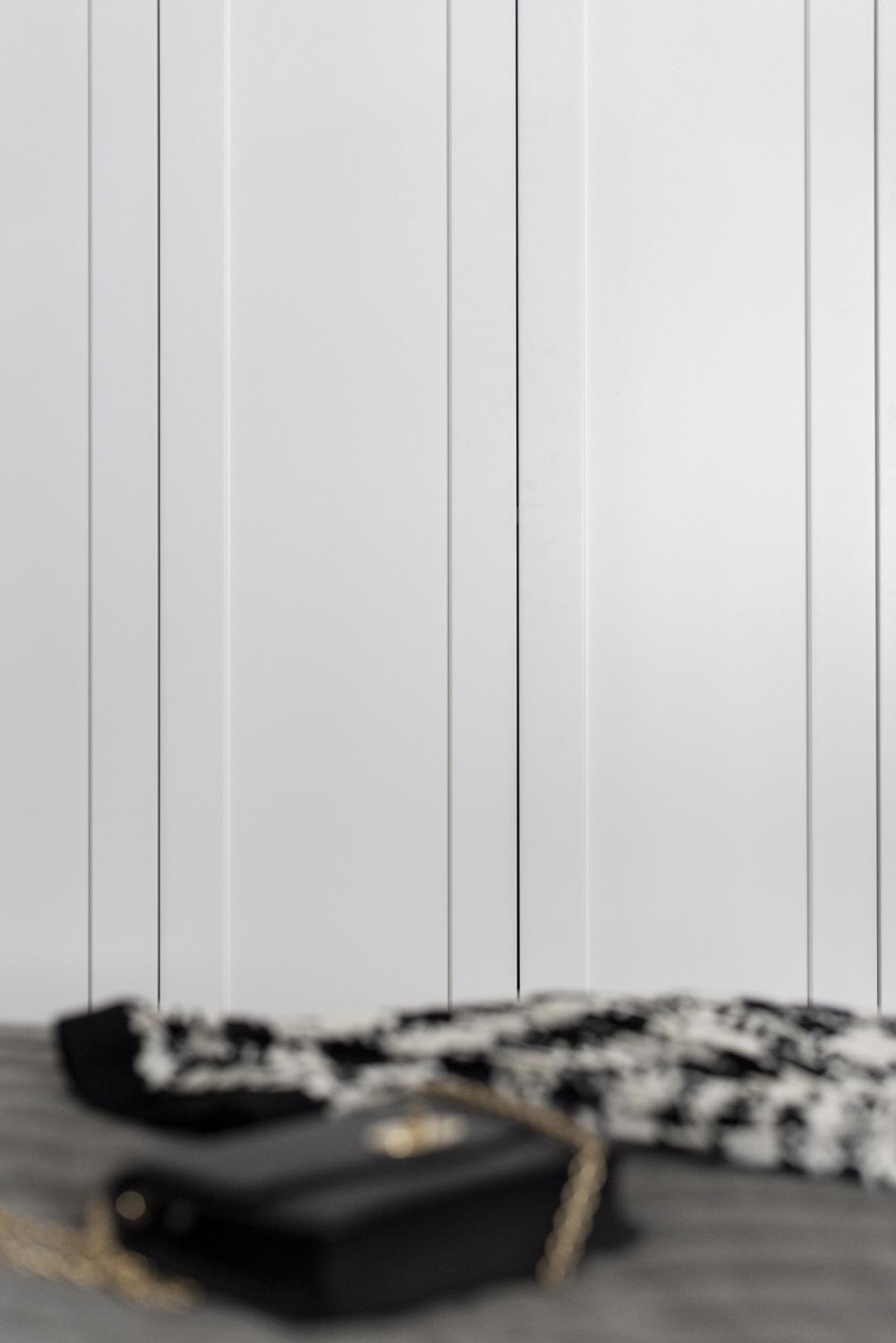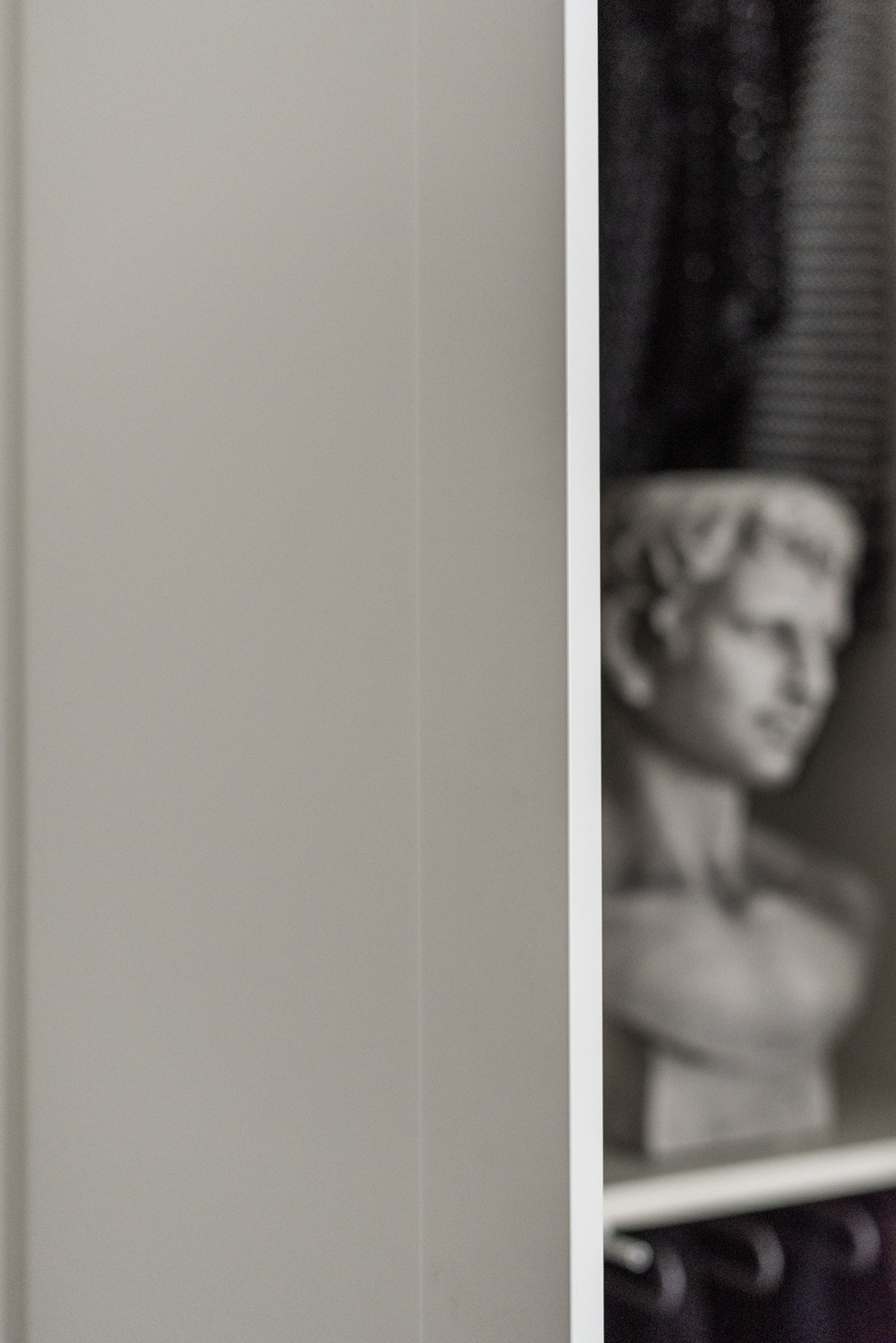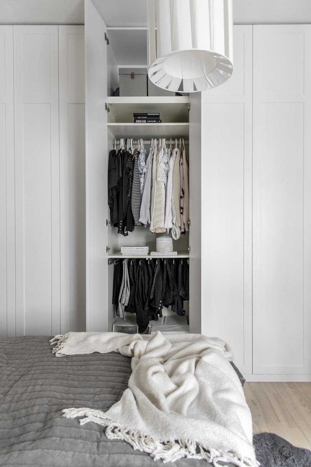 Sovrummet på Karlbergsvägen har fått en lyxig touch med hjälp av ljusa garderobsdörrarna "Af Kant" i vitt. Garderobslösningen är byggd på IKEA PAX-ramar, med push to open grepp och sockel ner mot golvet.