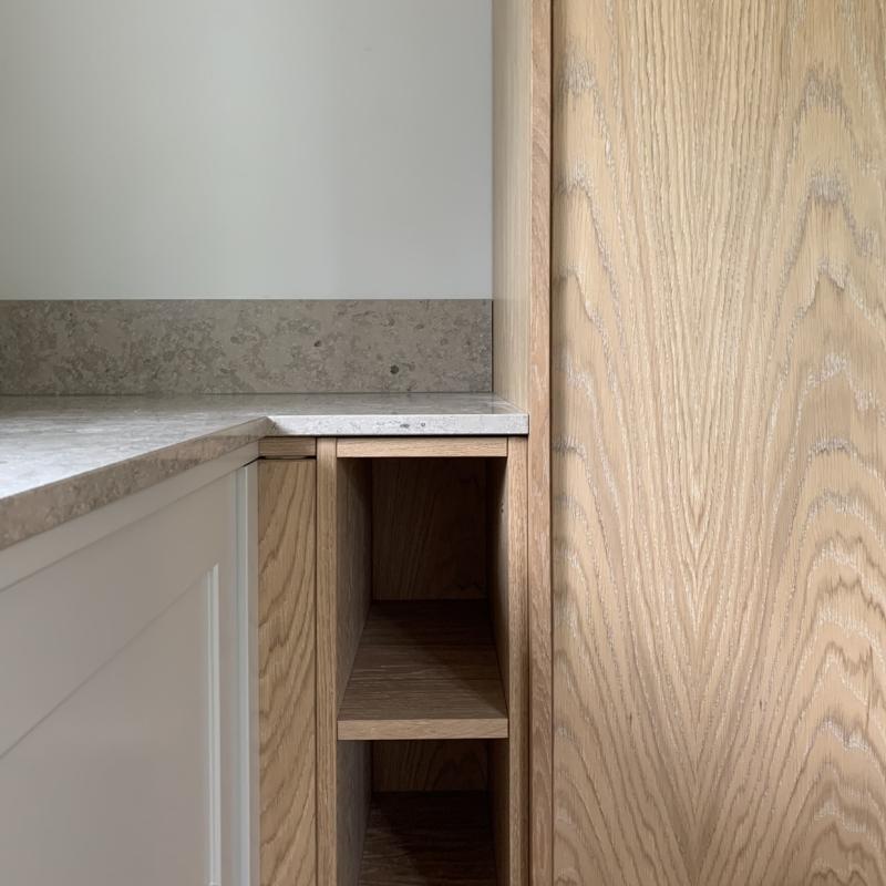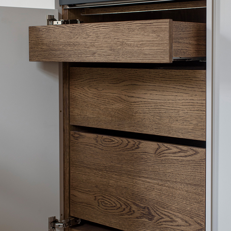 Vi tillverkar fronter till kök, garderober och andra förvaringslösningar i träfanér på grund av materialets unika egenskaper och resultat. Träfanér är ett vackert och levande material tillverkat av trä, där endast de finaste delarna av stocken väljs ut. Detta ger ett äkta resultat som passar för moderna hem och levnadssätt. Till skillnad från laminat skiljer sig produkter i träfanér åt. Ett och samma mönster eller print kan inte åstadkommas med träfanér eftersom materialet är levande och inte tryckt.