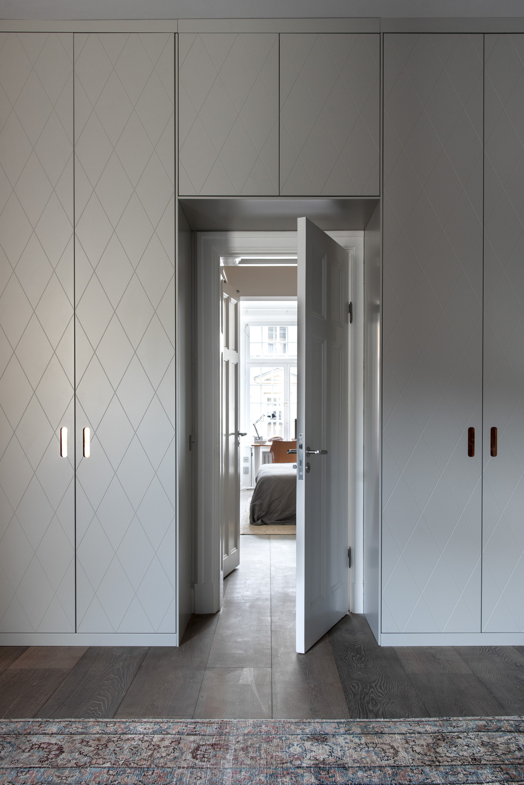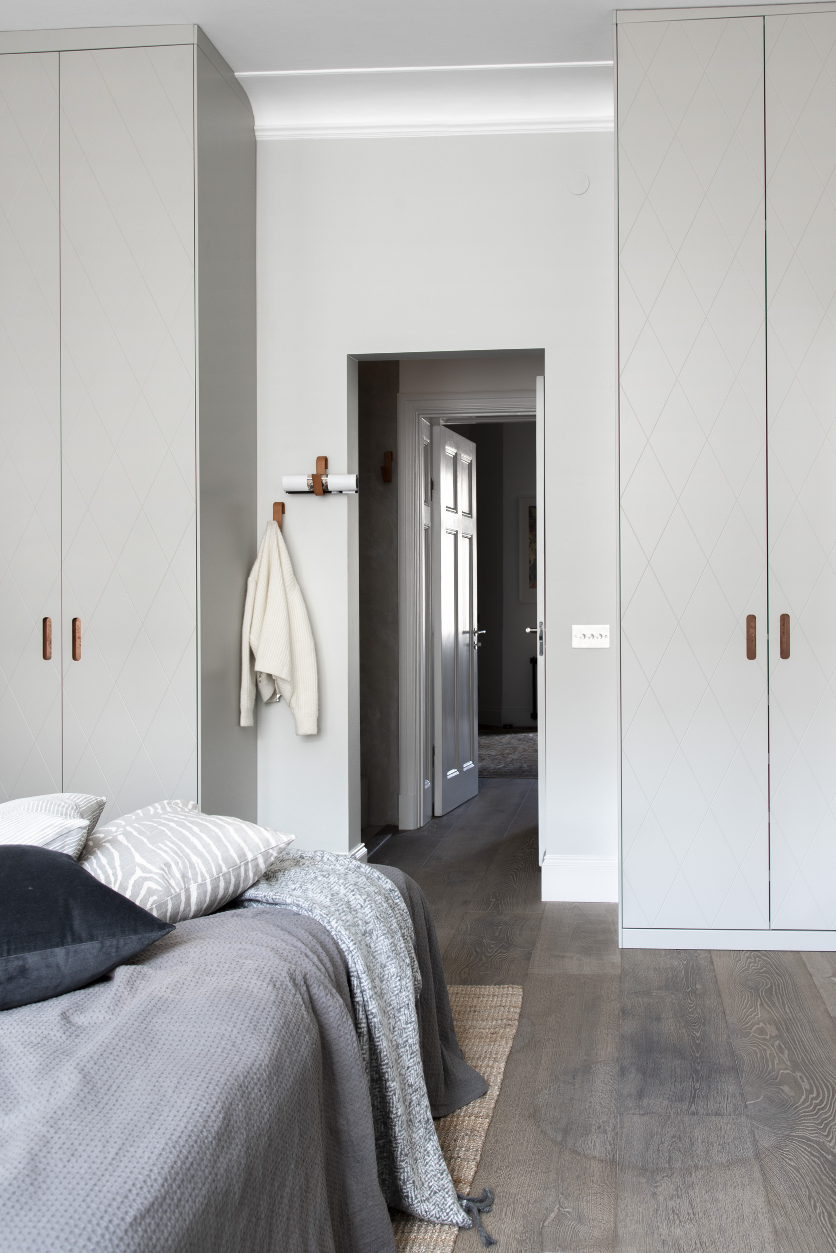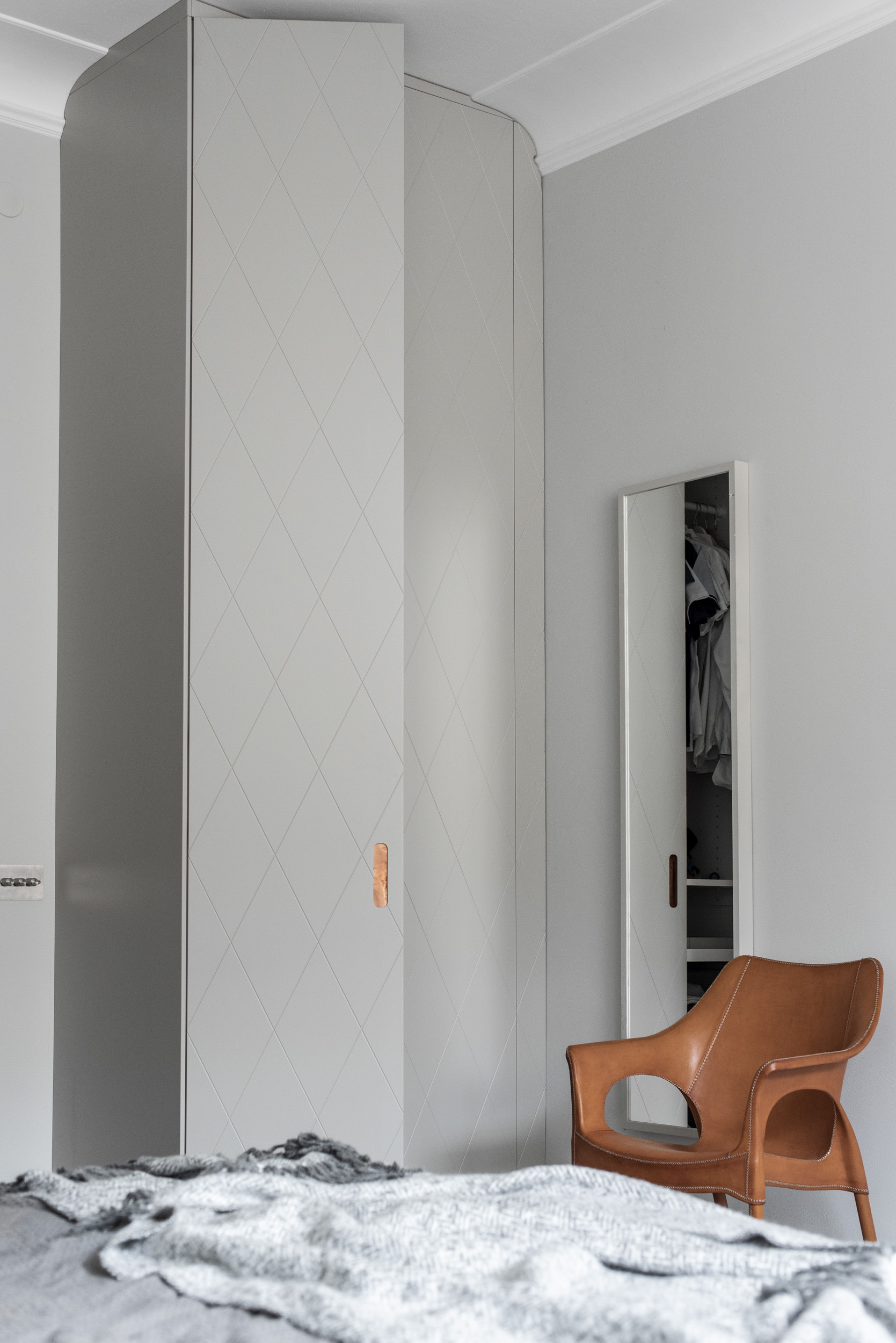Garderobslösningen i sovrummet har specialbeställda passbitar mot taket för att passa stuckaturen. Mönstret på dörrarna heter "Jester" och har plats för sockel ned mot golvet. Greppet på garderobsdörrarna är "Paula" och ett greppbakstycke i koppar.