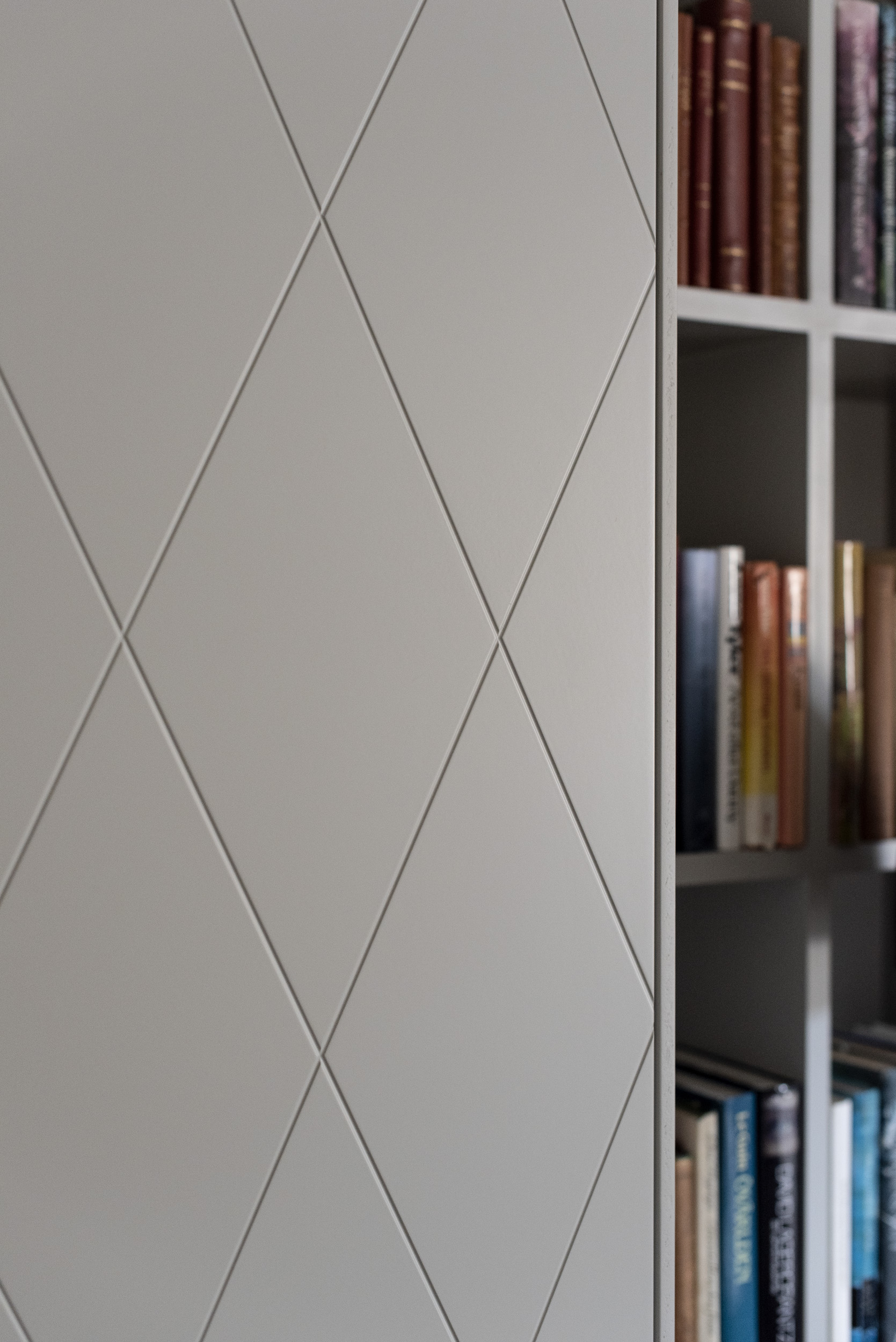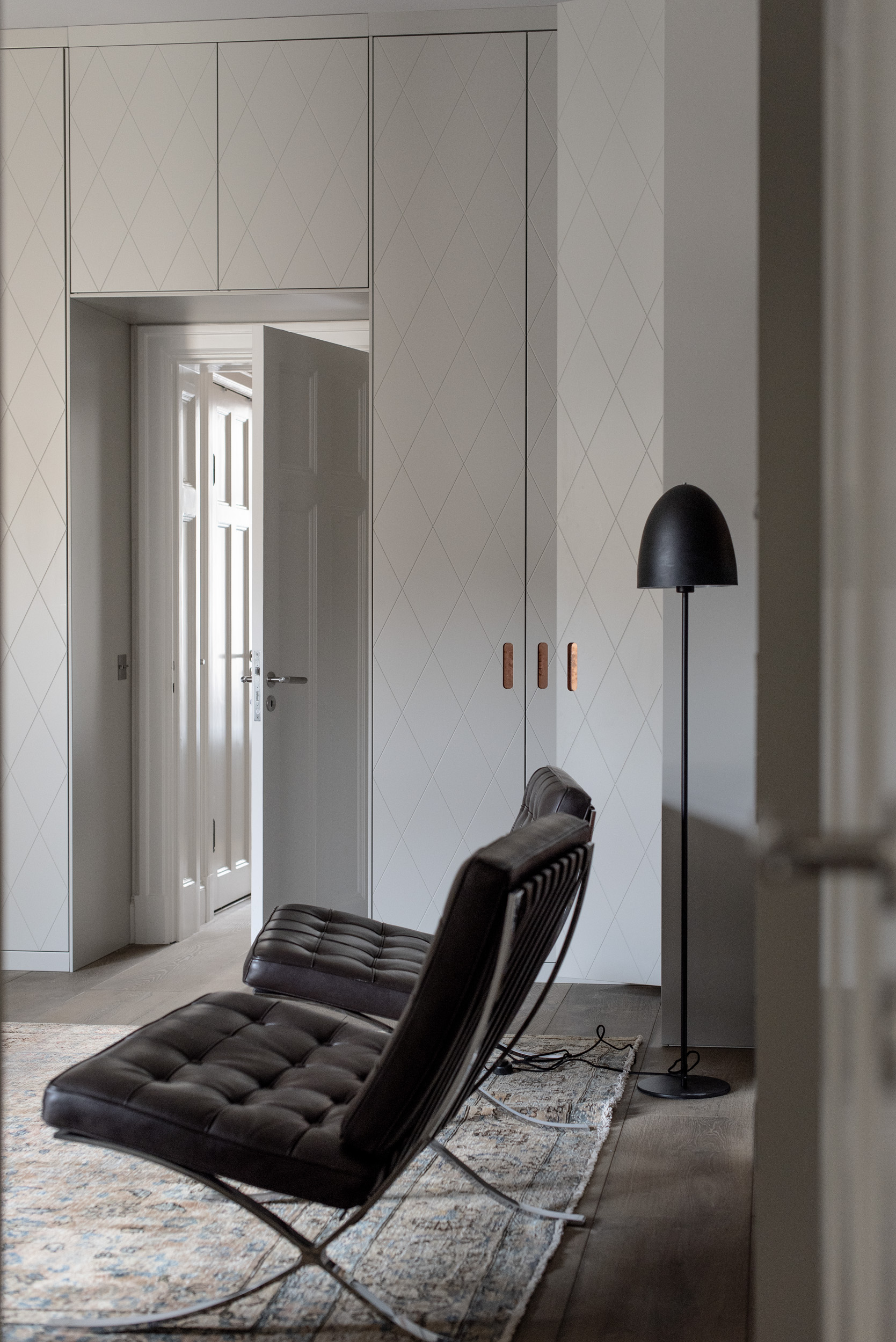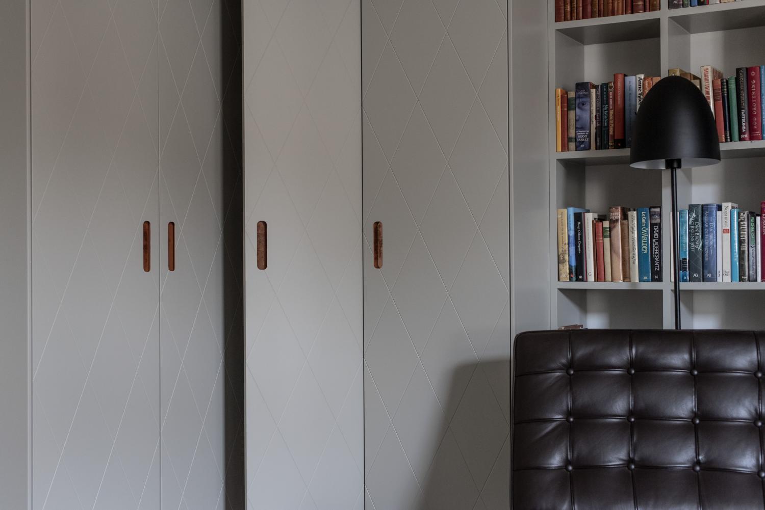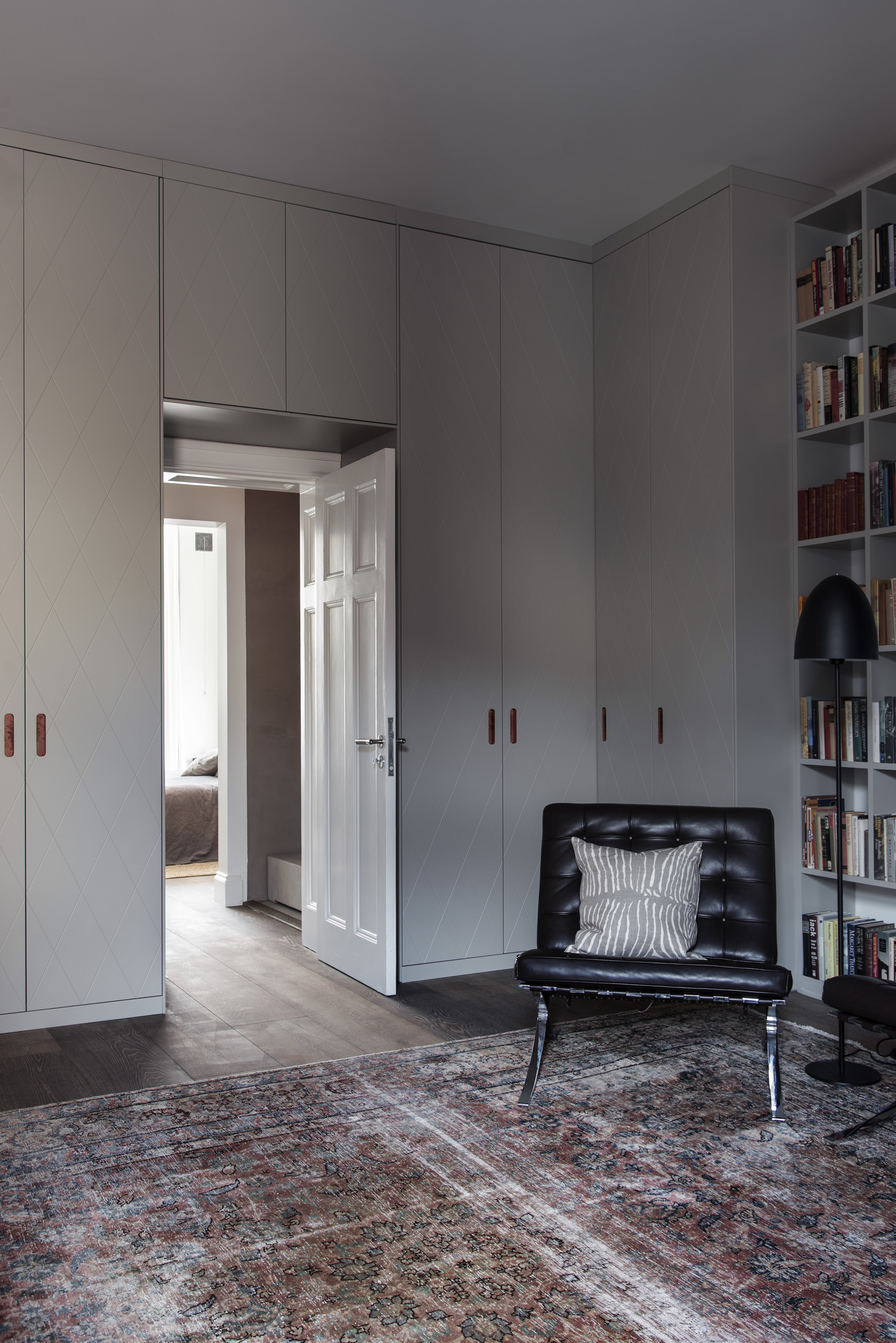 Garderobslösningen i sovrummet har specialbeställda passbitar mot taket för att passa stuckaturen. Mönstret på dörrarna heter "Jester" och har plats för sockel ned mot golvet. Greppet på garderobsdörrarna är "Paula" och ett greppbakstycke i koppar.