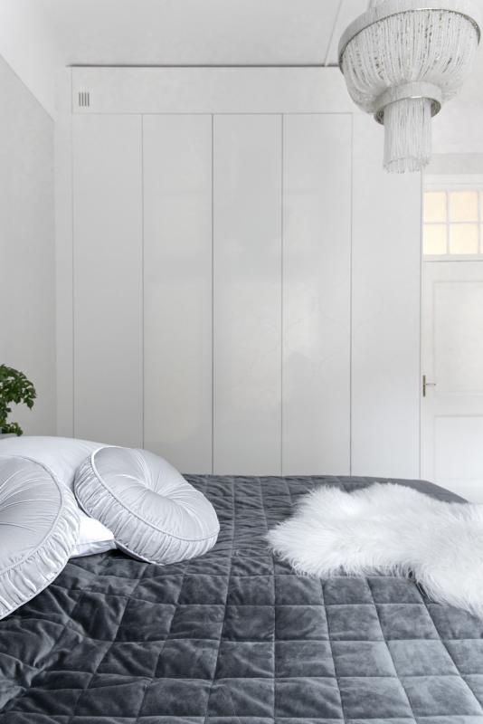 Sovrummet på Linnégatan har garderobsdörrar i mönstret Lily och nattduksbordet samt avlastningsmöbeln i vardagsrummet har luckor i modellen Coco.