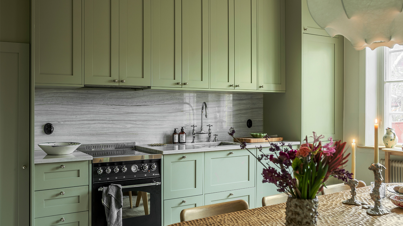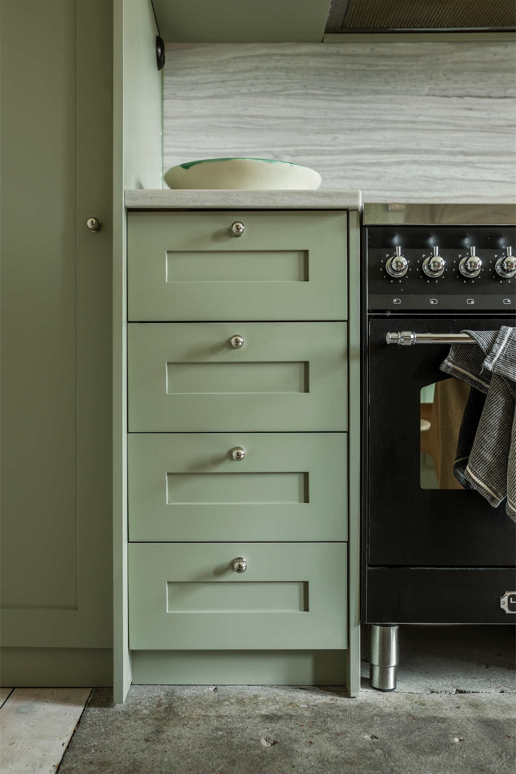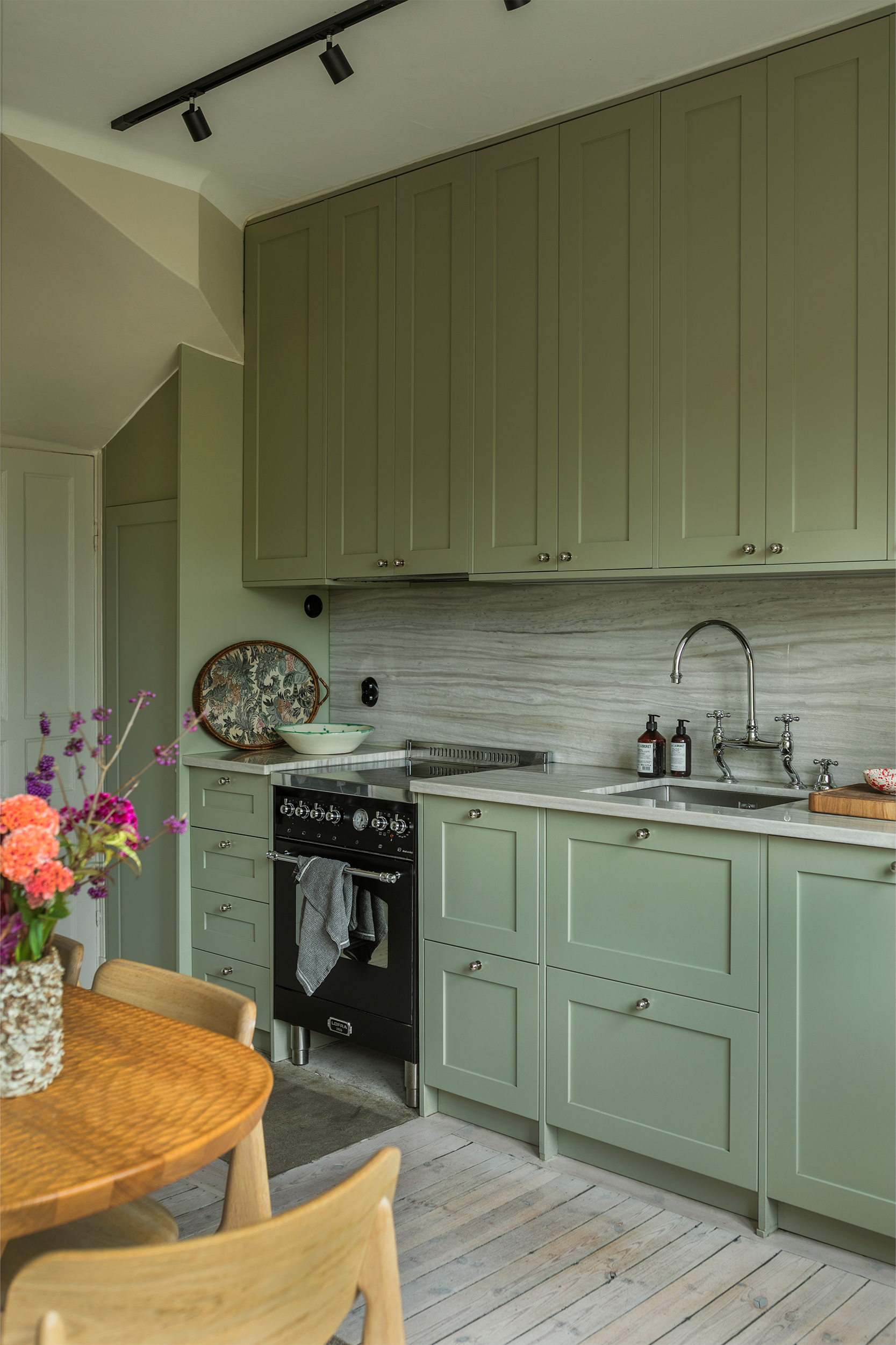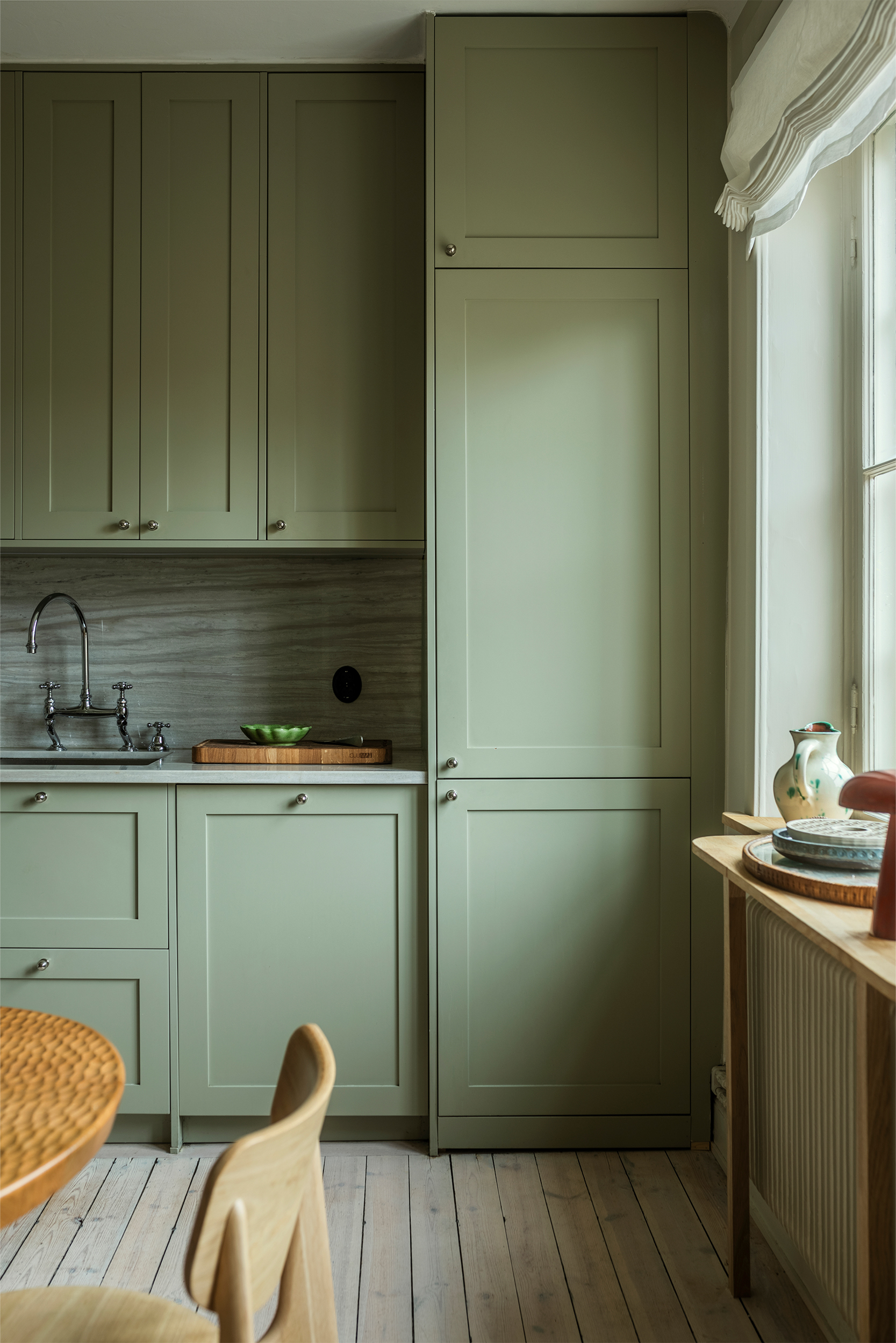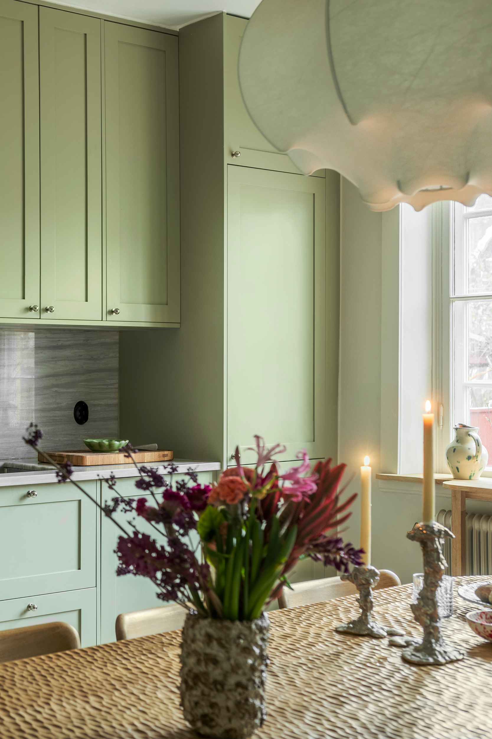 Genom de rum som följer in till köket, är samtliga av dem målade i två olika kulörer från Farrow and Ball. Just därför känns första steget in till köket familjärt då färgsättningen återupprepas. Här är väggar målade i kulören Shadow white och köksluckor och snickerierna i kulören French Grey. Förutom enhetlighet symboliserar köket en blandning av shaker stil och lekfull modernism. Köksluckorna har skräddarsytts för att gå ända vägen upp till tak, distanslister sitter mellan stommarna från IKEA och köksluckorna i modellen Ramses har en rak profil som är tuff men självklar i kökets miljö. Trots tidigare flyttar, hem och kök, har det konstaterats att det aldrig varit lika självklart att spendera tid i ett kök som det gör i just detta hem. Kan det bero på den stängda planlösningen som gjort att köket just blivit hemmets knutpunkt? Ett kök där både pyssel och matlagning har sin givna plats och där söndagsfrukosten dukas fram för att avnjutas i gemenskap.