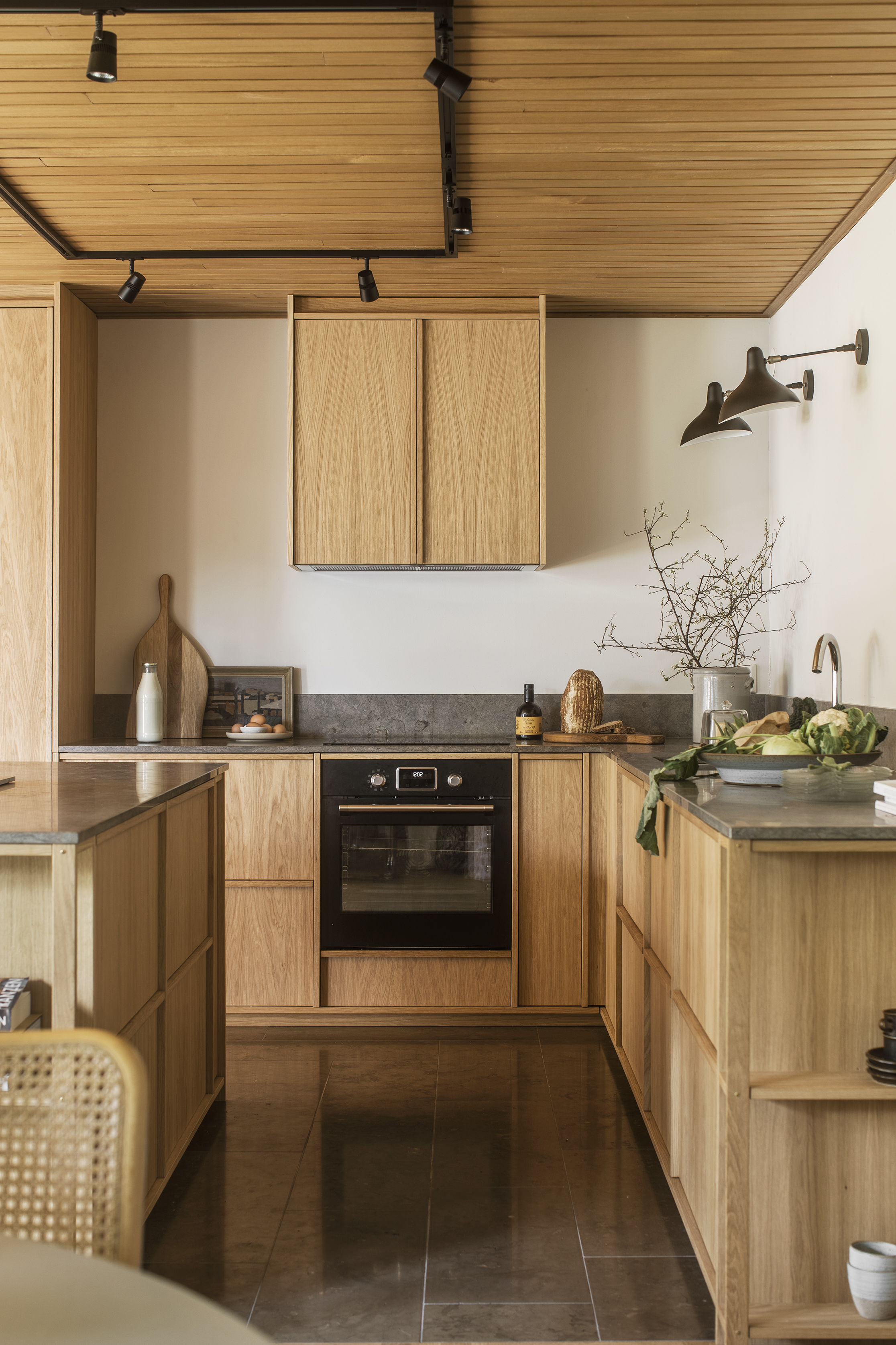 Med köksluckor i True Oak plockas värmen i detta kök upp av både golv och tak.