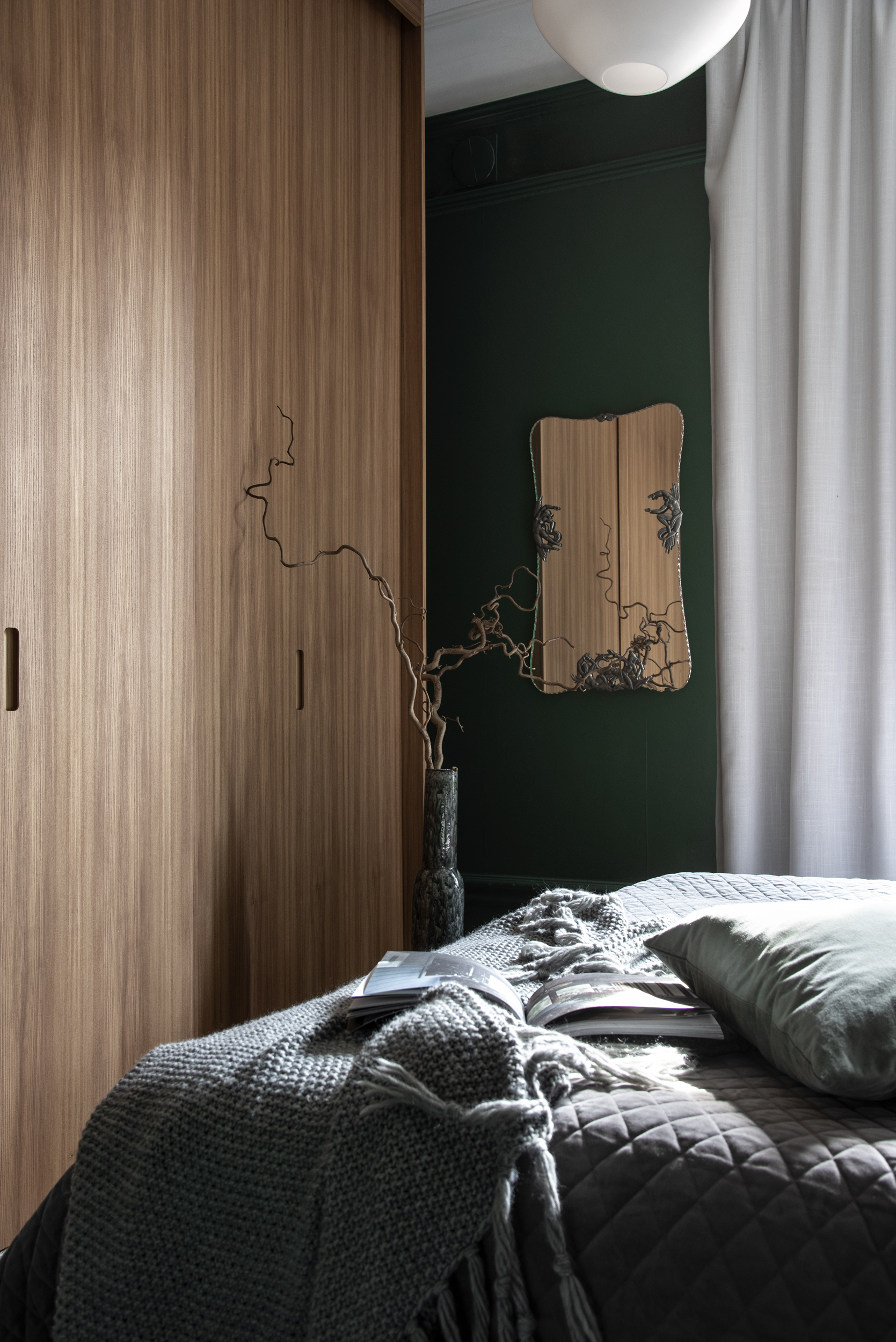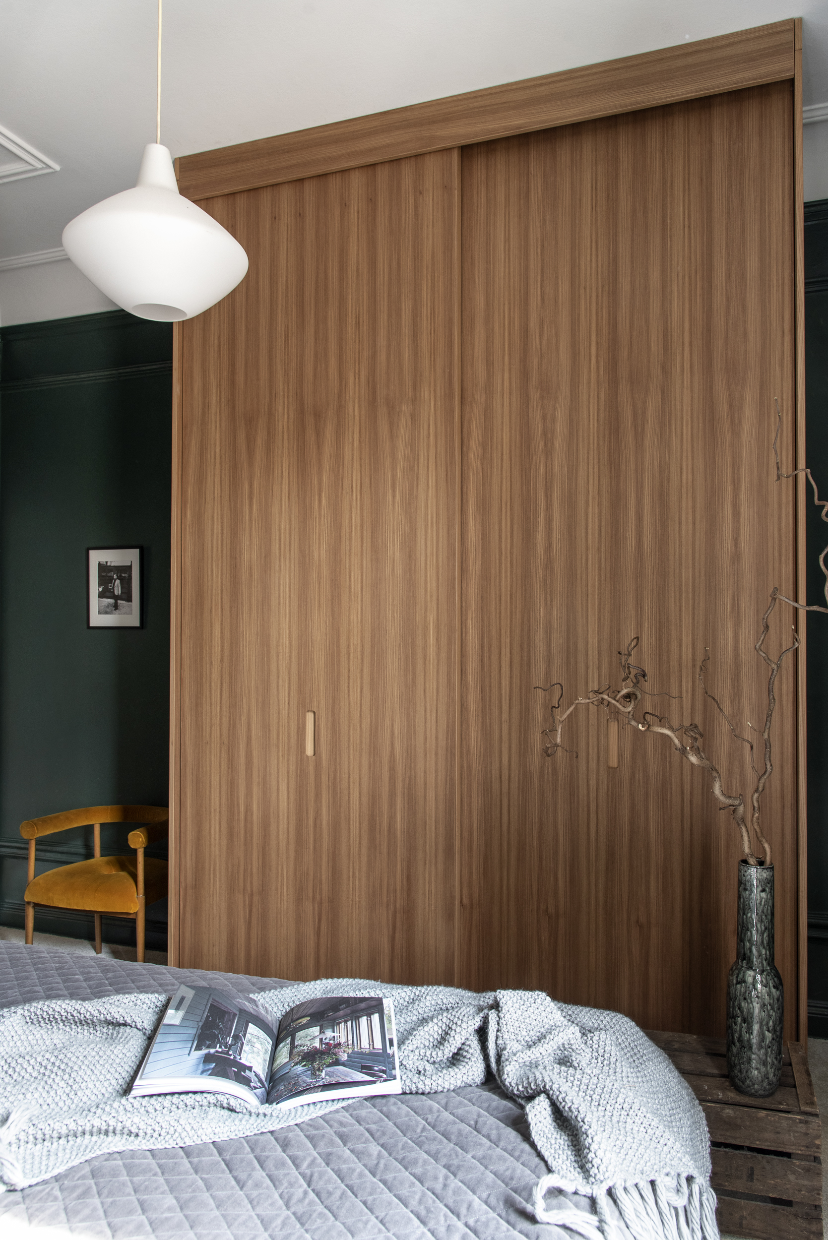 Stilren sovrumsförvaring på Renstiernas gata med topphängd skjutdörrsgarderob i True Elm.
