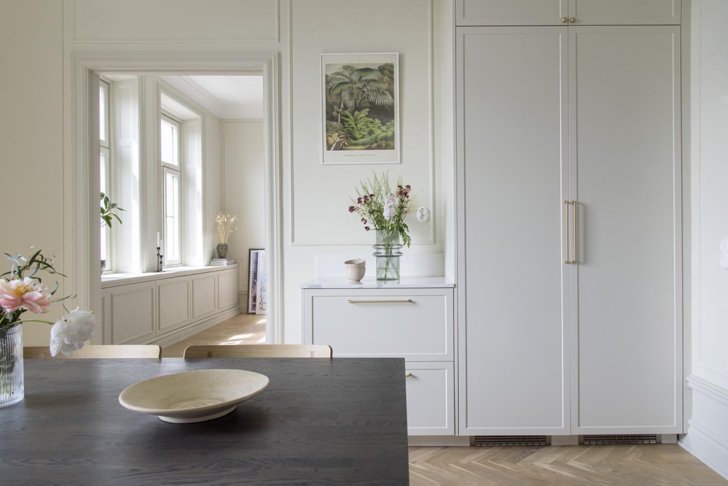 Speciellt för detta kök är att fronterna Alberta har måttbeställts för att framhäva exklusiva vitvaror samt passa till Ikeas köksstommar.