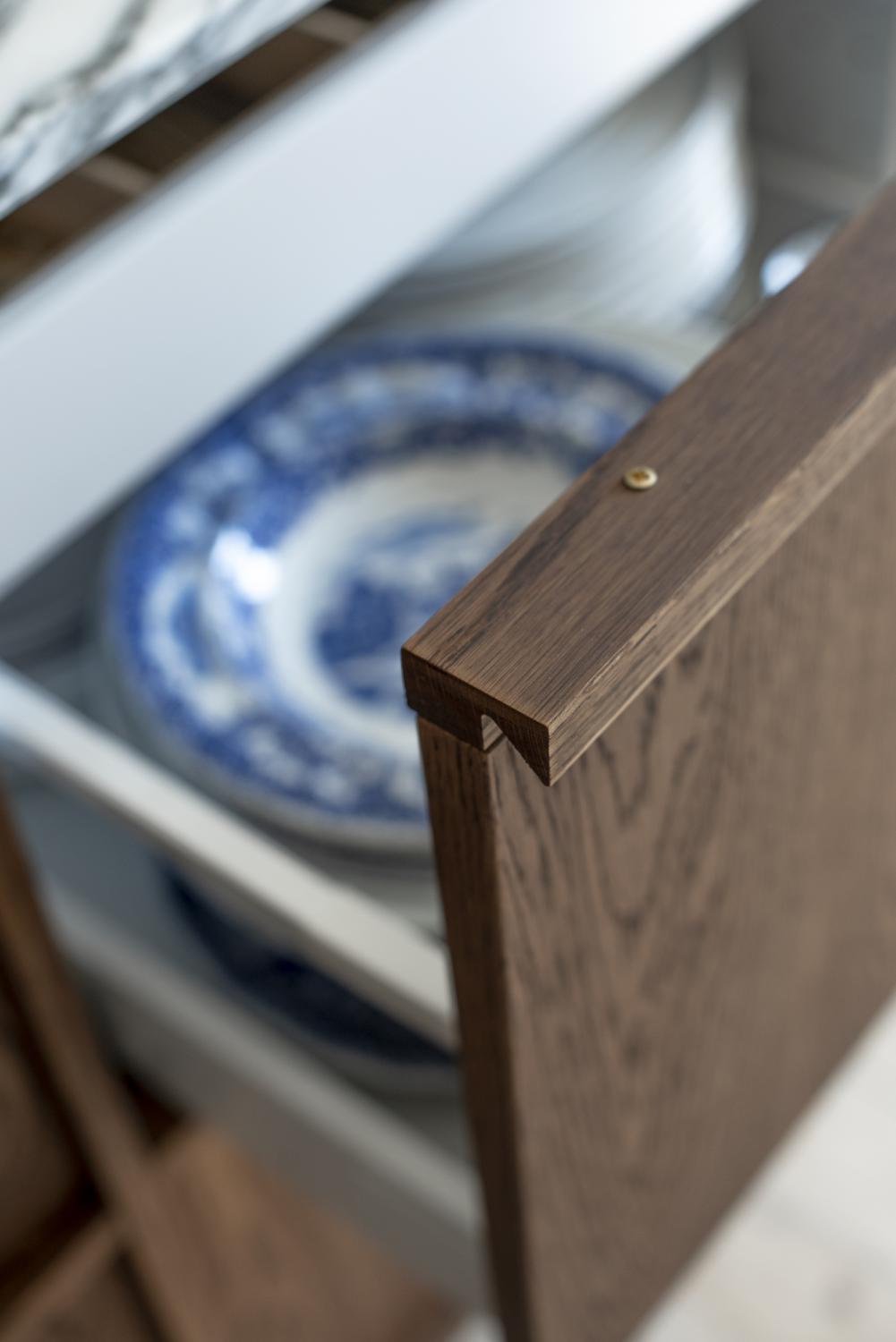 Överskåpen och högskåpen är i vår släta lucka Coco och bänkskåpen med grepplist är i Dark Oak. Det måttbeställda väggskåpet är även det tillverkat i Dark Oak vilket knyter samman de olika luckorna och materialvalen i köket.