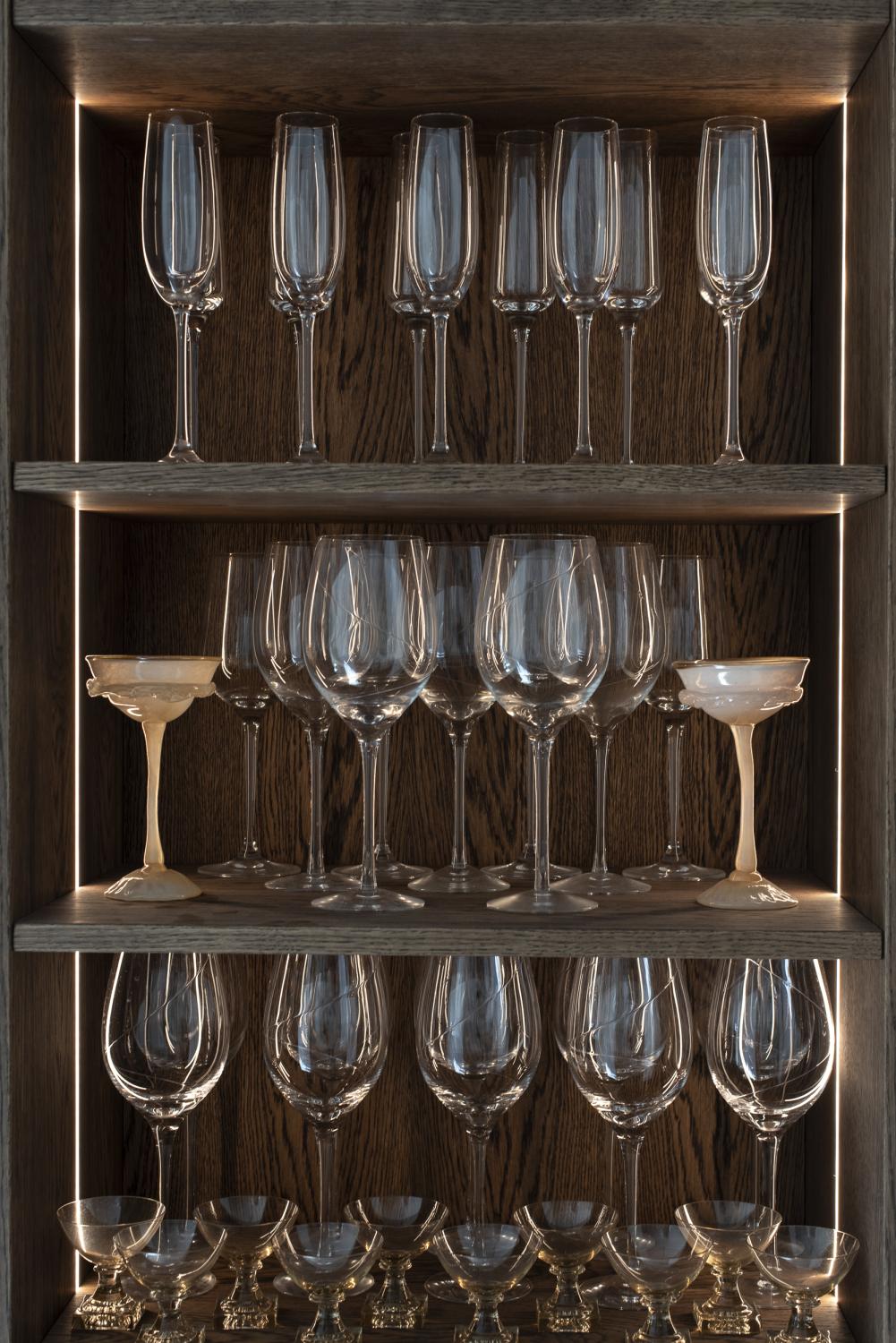 Glasen i skåpet exponeras vackert med hjälp av infräst belysning i skåpets sidor samt nedre täcksida.
