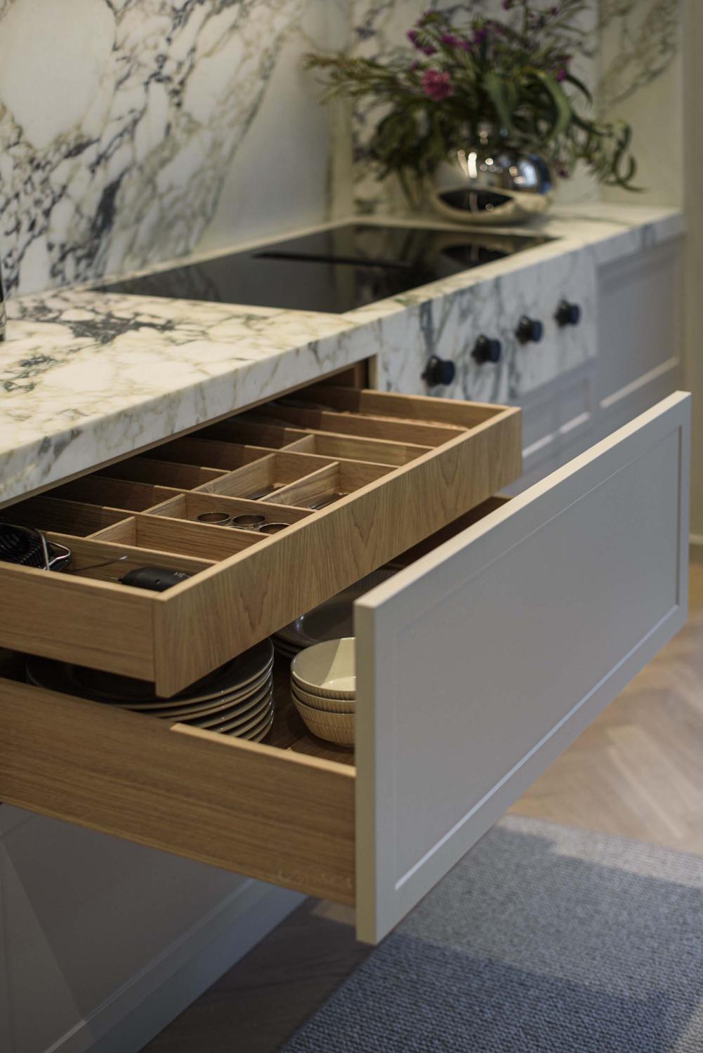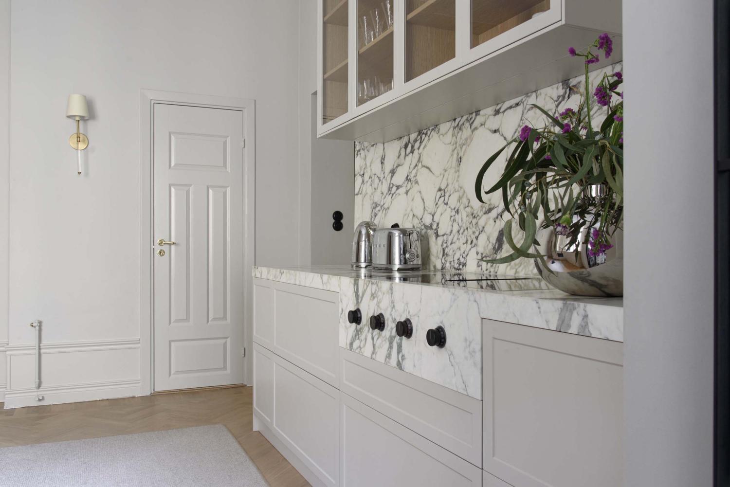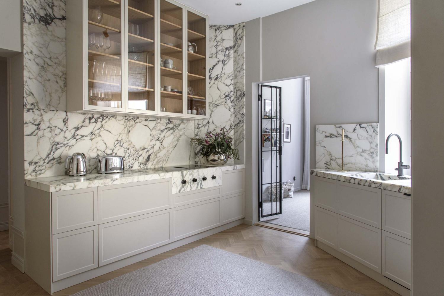 Kliv in i detta kök och möt vår mjuka ramlucka Alberta i kombination med exklusiva vitvaror och ståtlig sten.