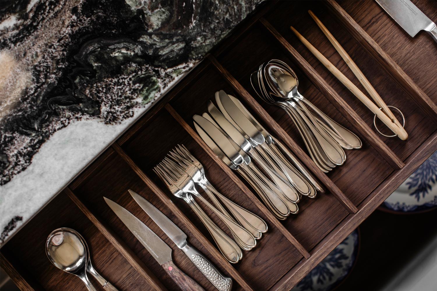 Under renoveringen har planlösningen ändrats och köket ligger numera i mitten av hemmet istället för i andra ändan av lägenheten. Med stommar i melamin, inredning i California Oak och fronter i Alberta, var ambitionen att designen skulle kännas mer som ett vardagsrum än ett kök. Precis som stilen i resten av lägenheten, skulle även köket utstråla en balans mellan det vågade och det sobra.