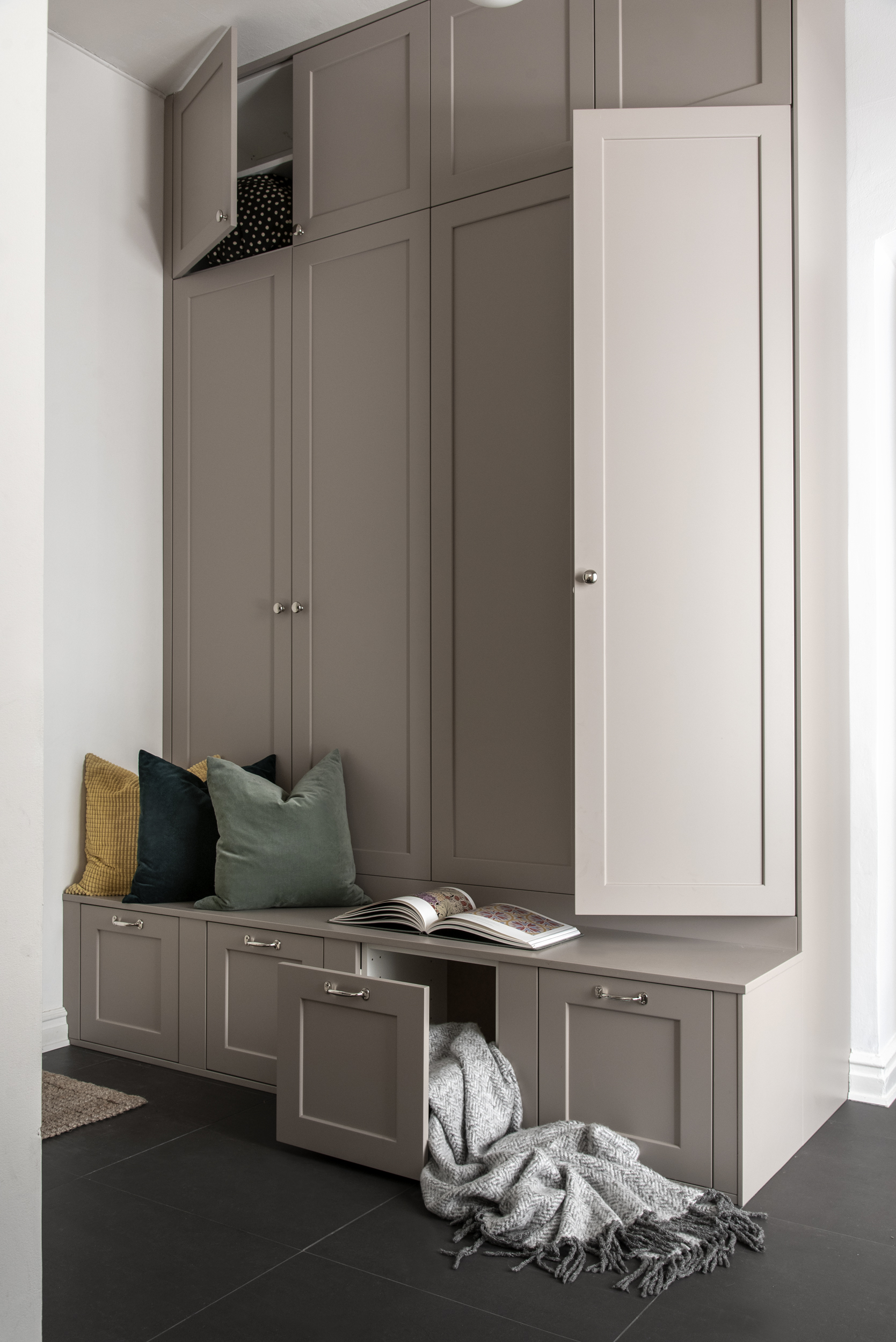 I hallen på Surbrunnsgatan är förvaringen smart planerad. Garderobslösningen är byggd på två olika IKEA stommar: PAX för garderoben och METOD för nederdelen.