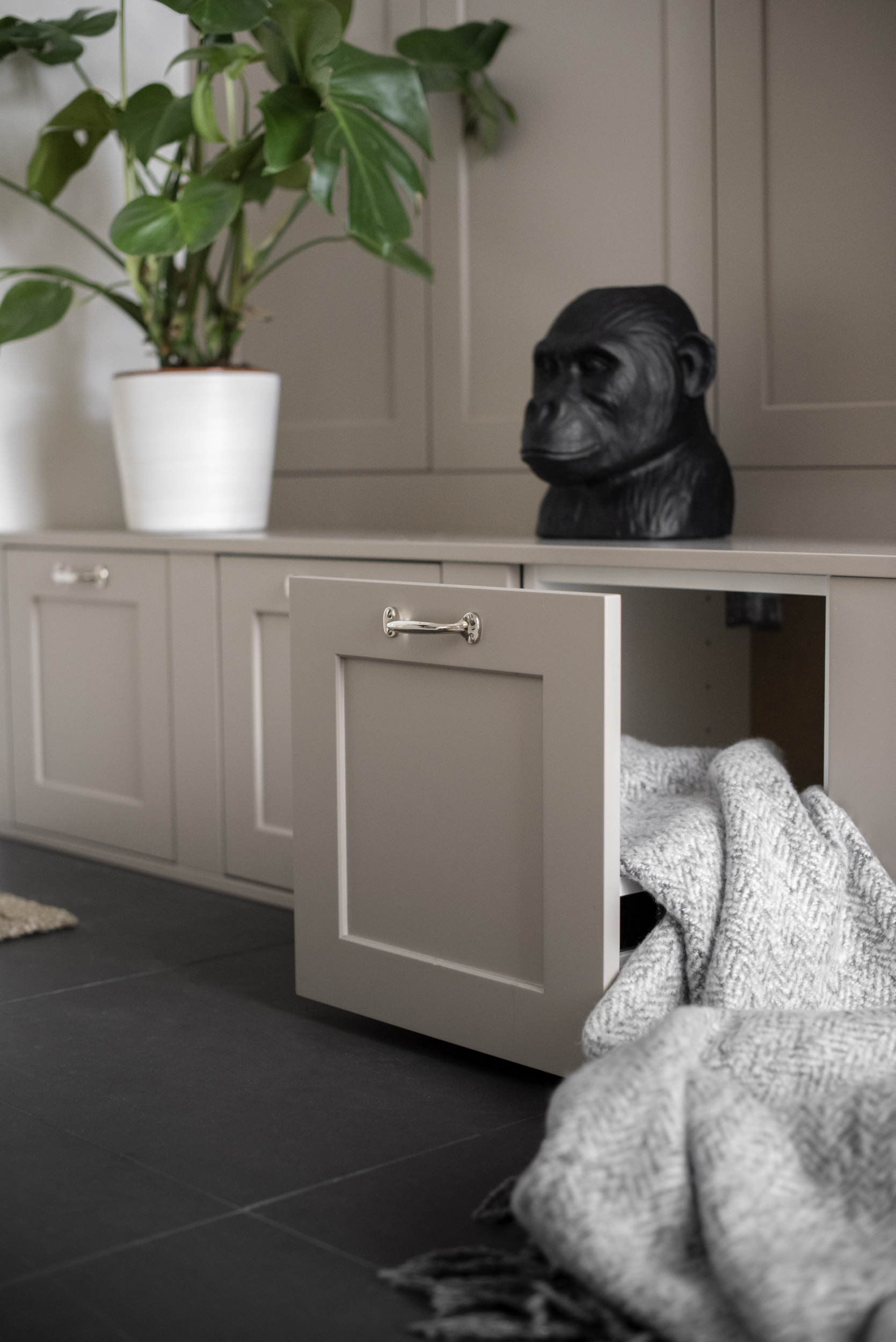 Modellen på luckorna heter "Ramses" och har specialbeställda täcksidor samt knoppar och handtag från Beslag Design.