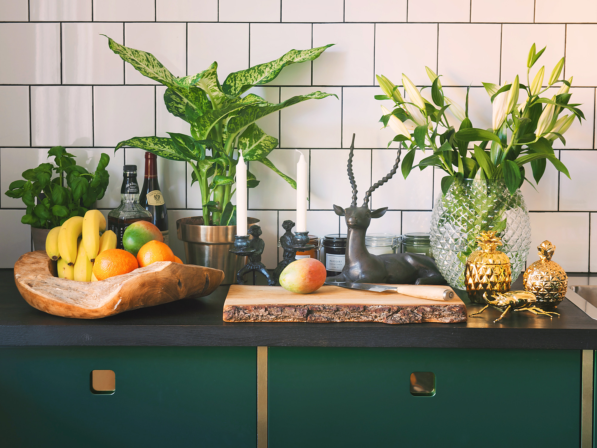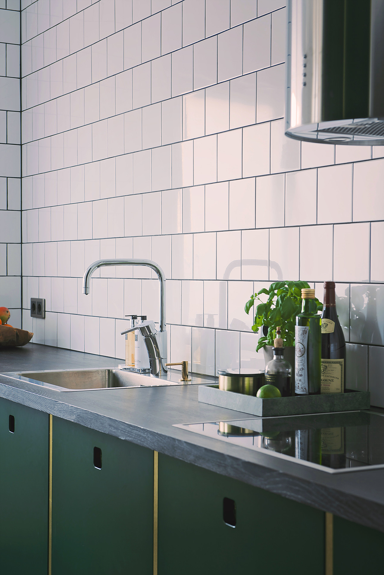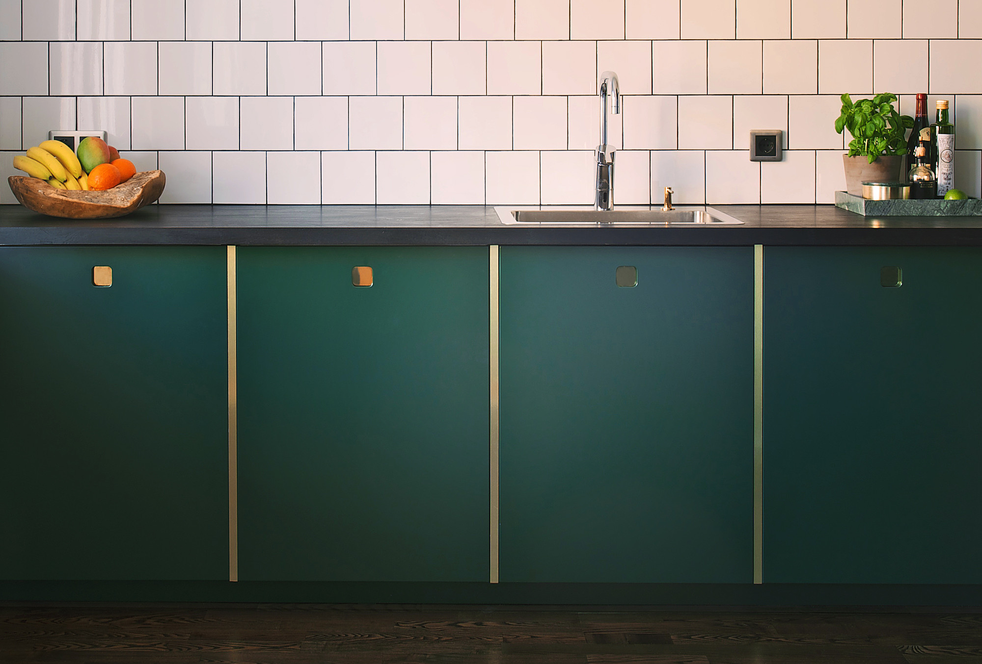 Lekfullt är ledordet på Tämnarvägen, där släta köksluckor i grönt bryts av med greppbakstycke och distanslist i modern mässing. Köket är monterat på IKEA-stommar med fräst grepp på luckorna, färgkod 7020-B90G.