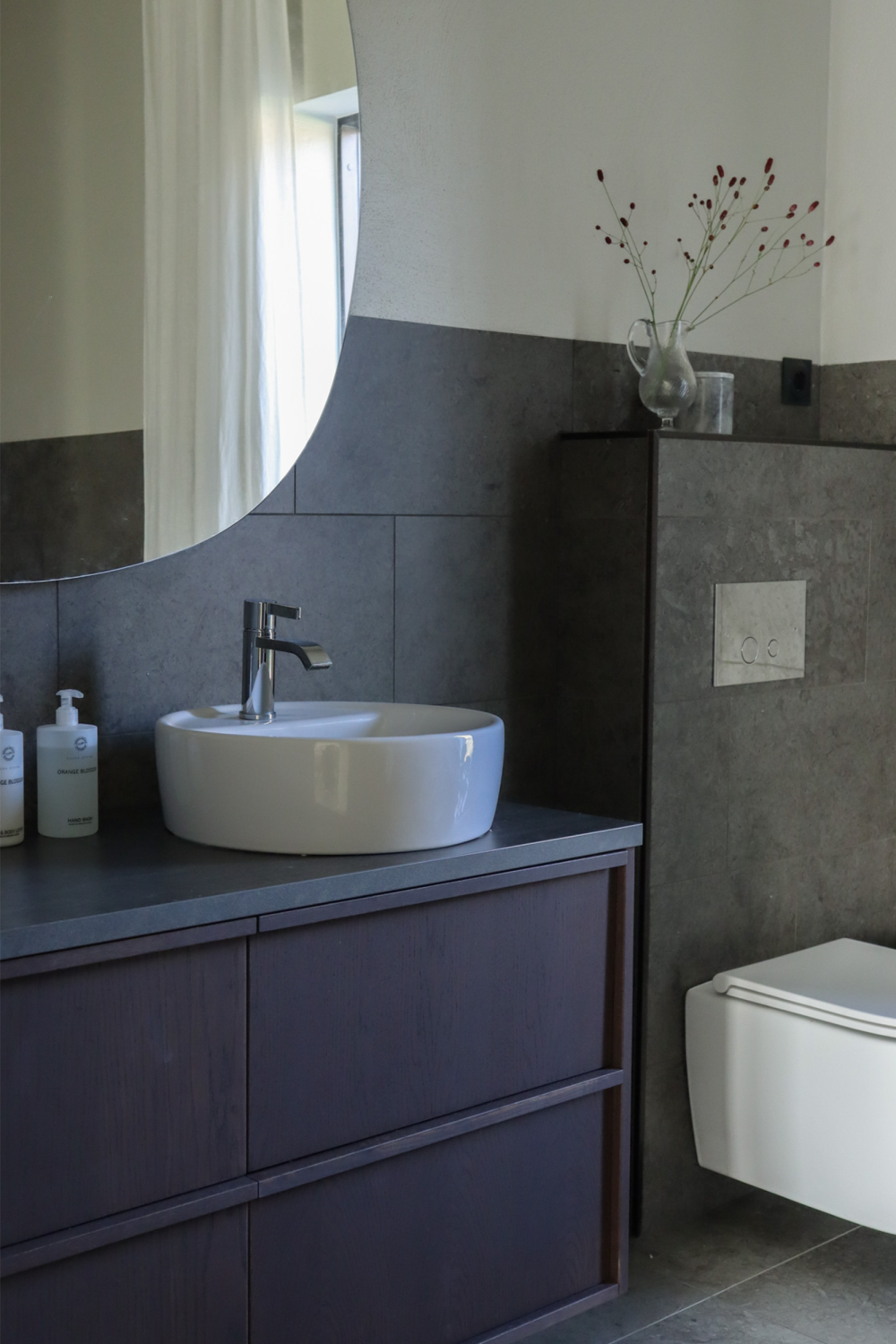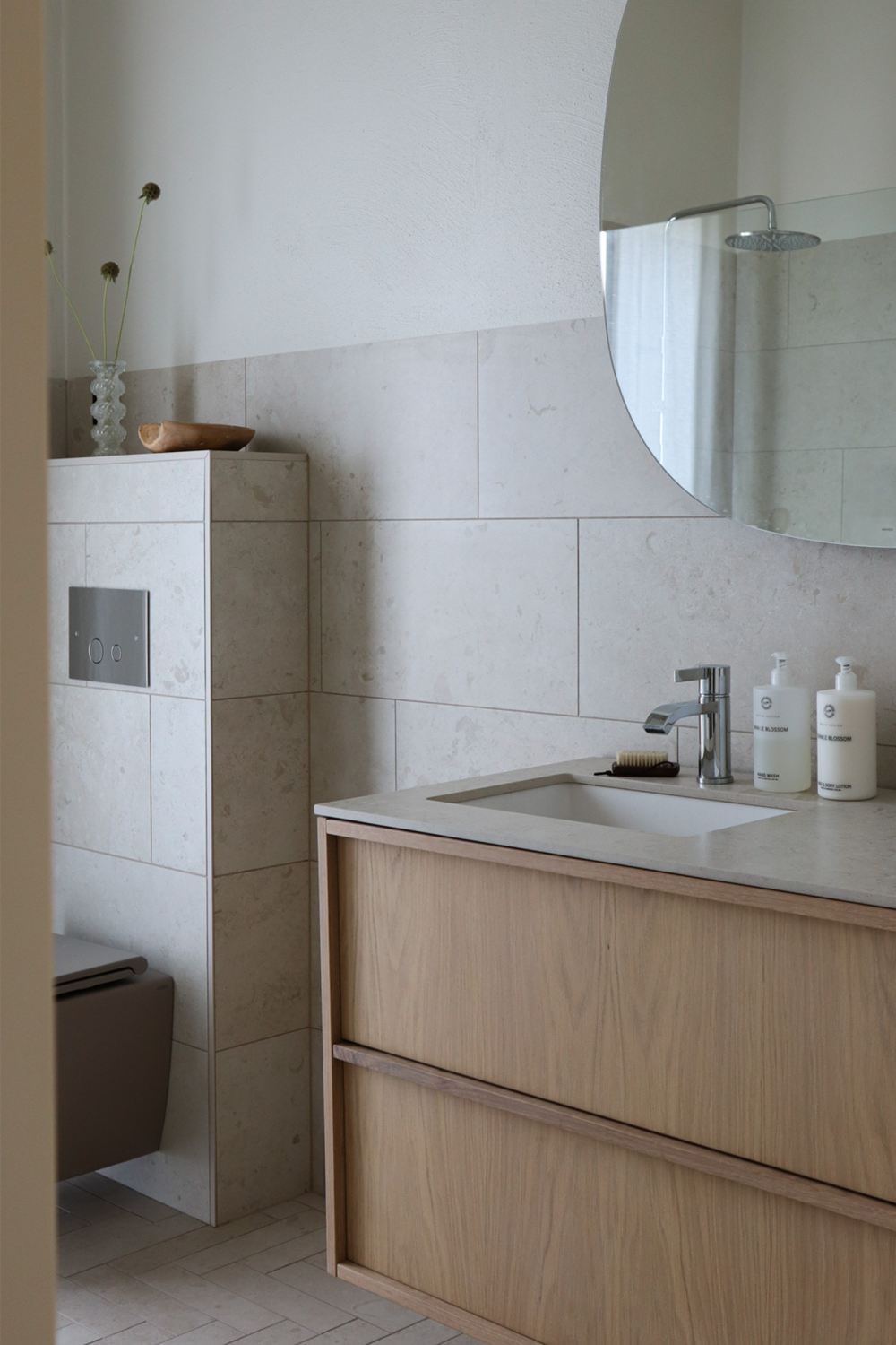 För att låta ekens naturlighet följa med genom huset valde paret att låta även badrummen plocka upp träets ton i måttbeställda kommoder.