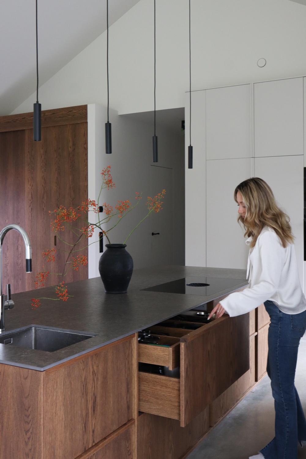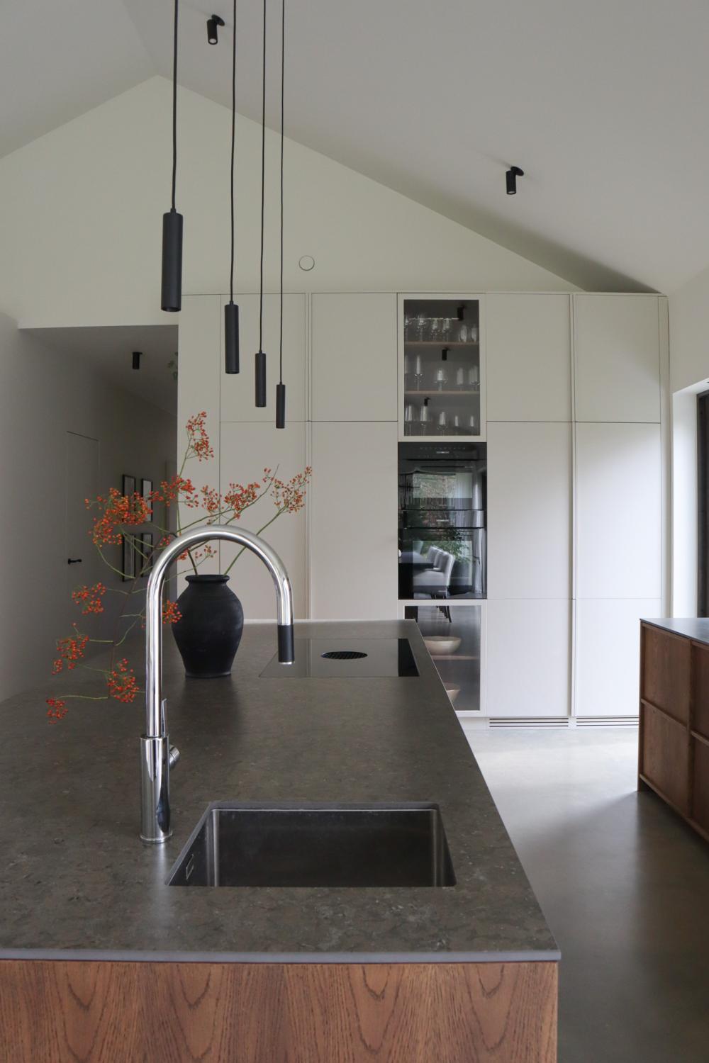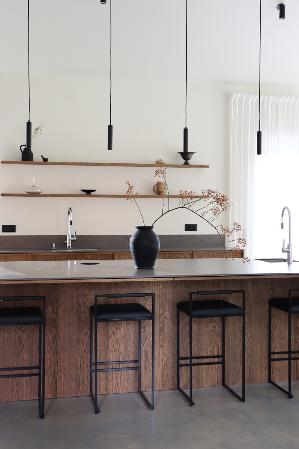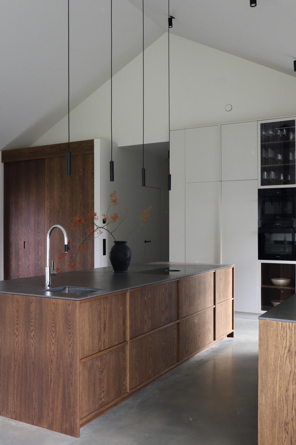 Runt köket öppnar sig rymden - högt i tak och utsikt mot skogen där en grupp hjortar mjukt tassar över höstens löv. Lugnet som naturen utanför ger, reflekteras i kökets materialval. Ett möte mellan varmt och svalt som tillsammans skapar en harmoni mellan väggarna.