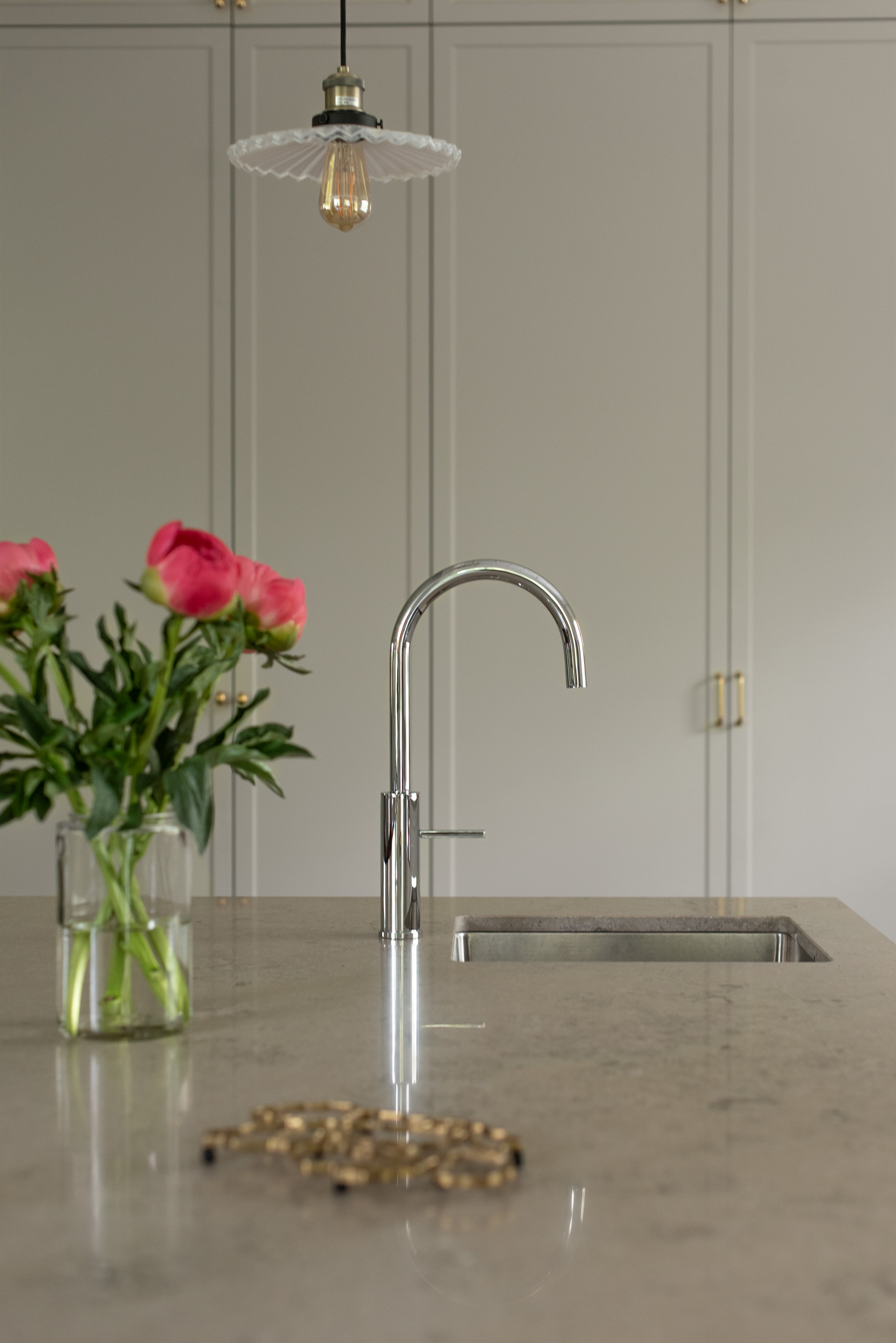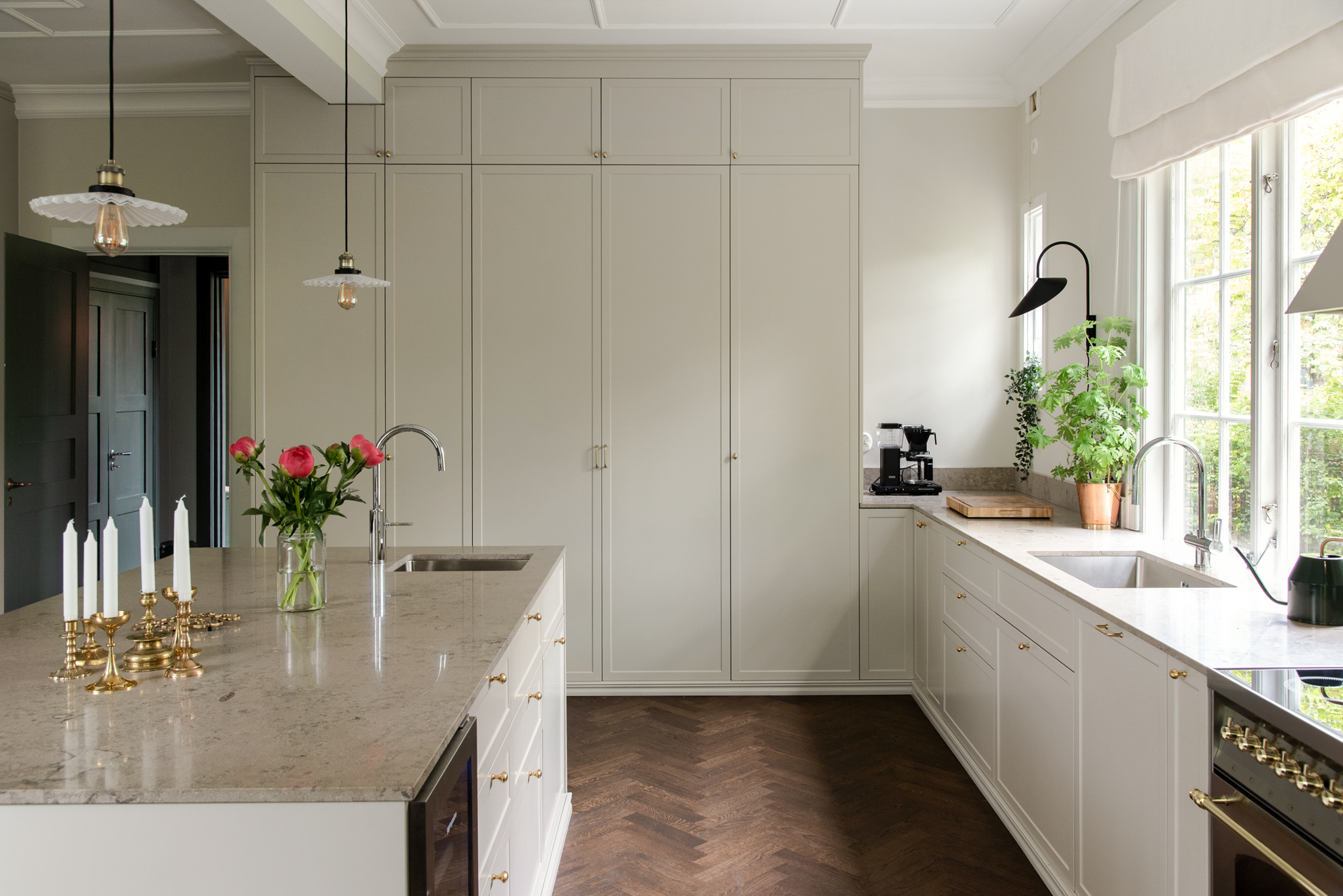 Det generösa ljusinsläppet från tre väderstreck gör att rummet badar i naturligt ljus, där våra köksluckor Alberta bidrar med ett stilla och harmoniskt uttryck.