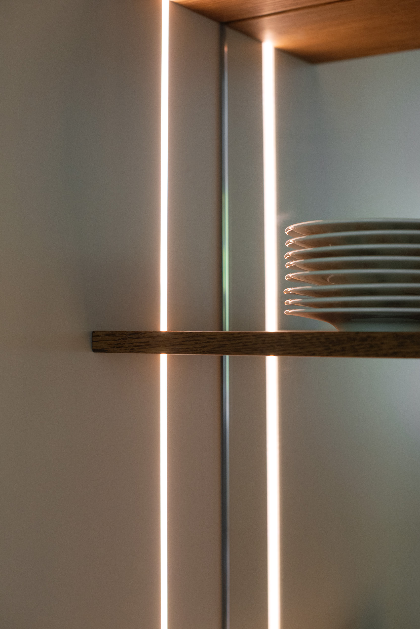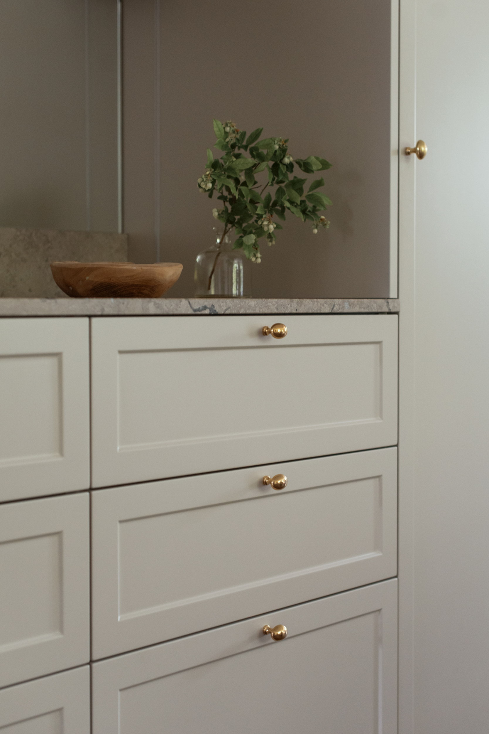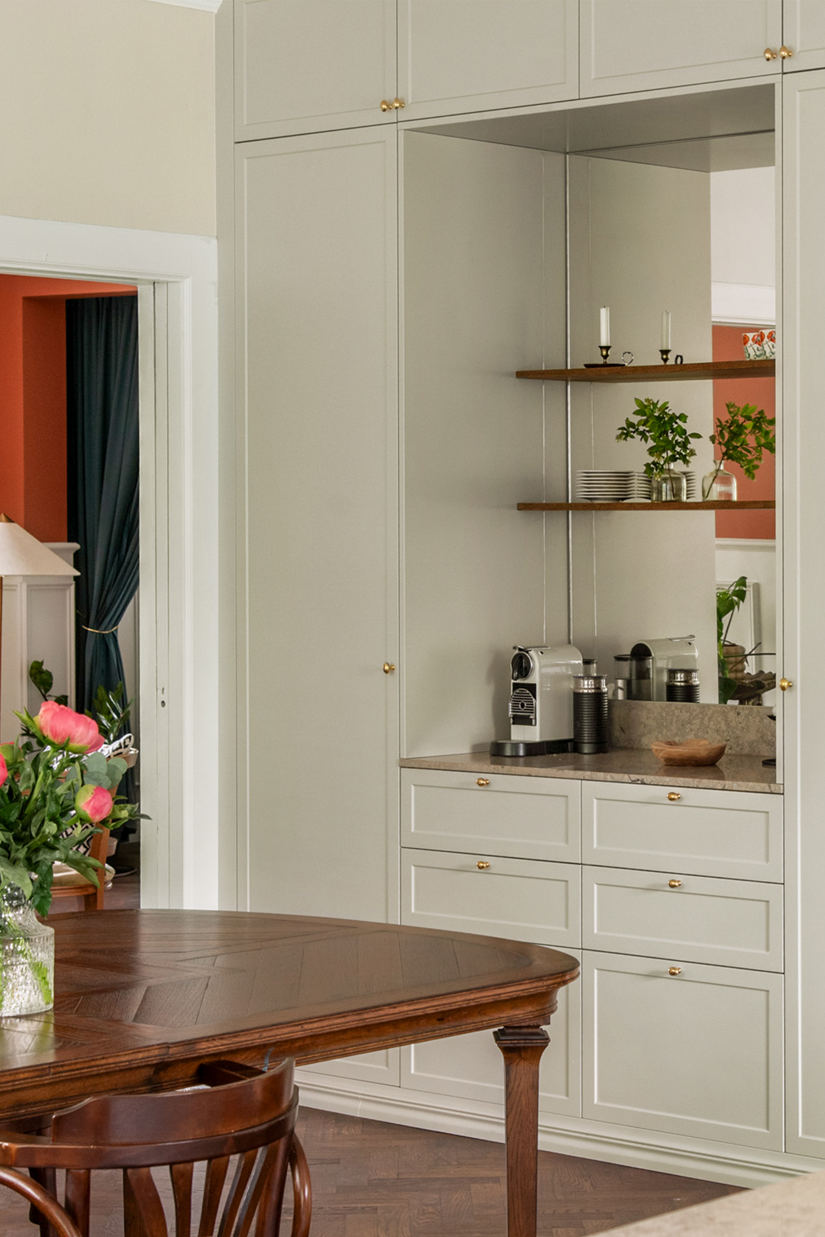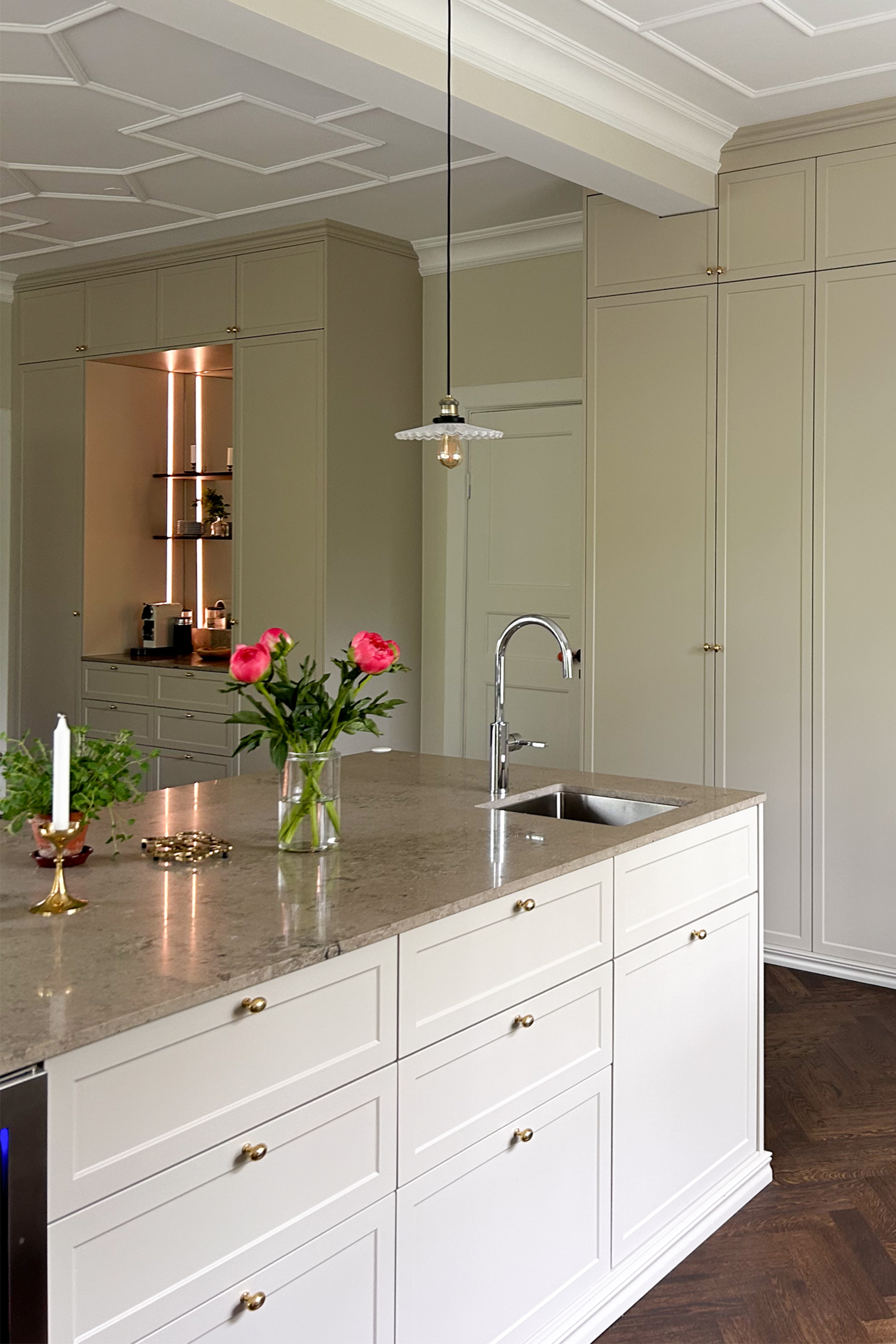 Som ett komplement till det L-formade köket och den rymliga köksön har paret skapat ett kaffe- och skafferiskåp intill matbordet - en unik detalj som ger köket tydliga funktioner, samtidigt som helheten hålls elegant, personlig och kreativ.