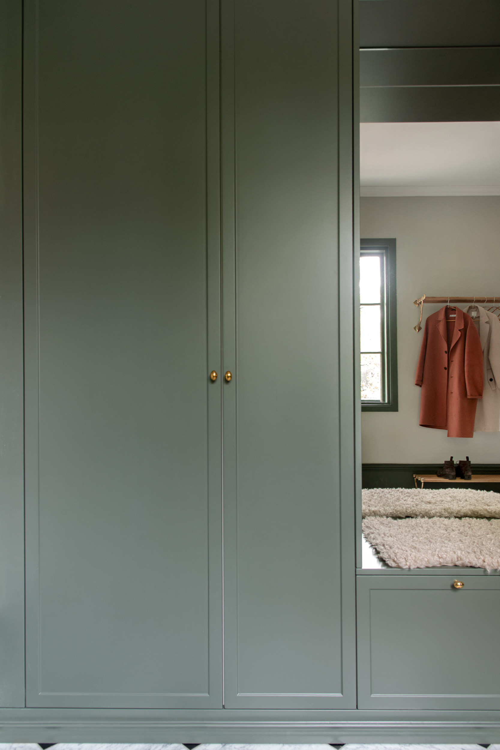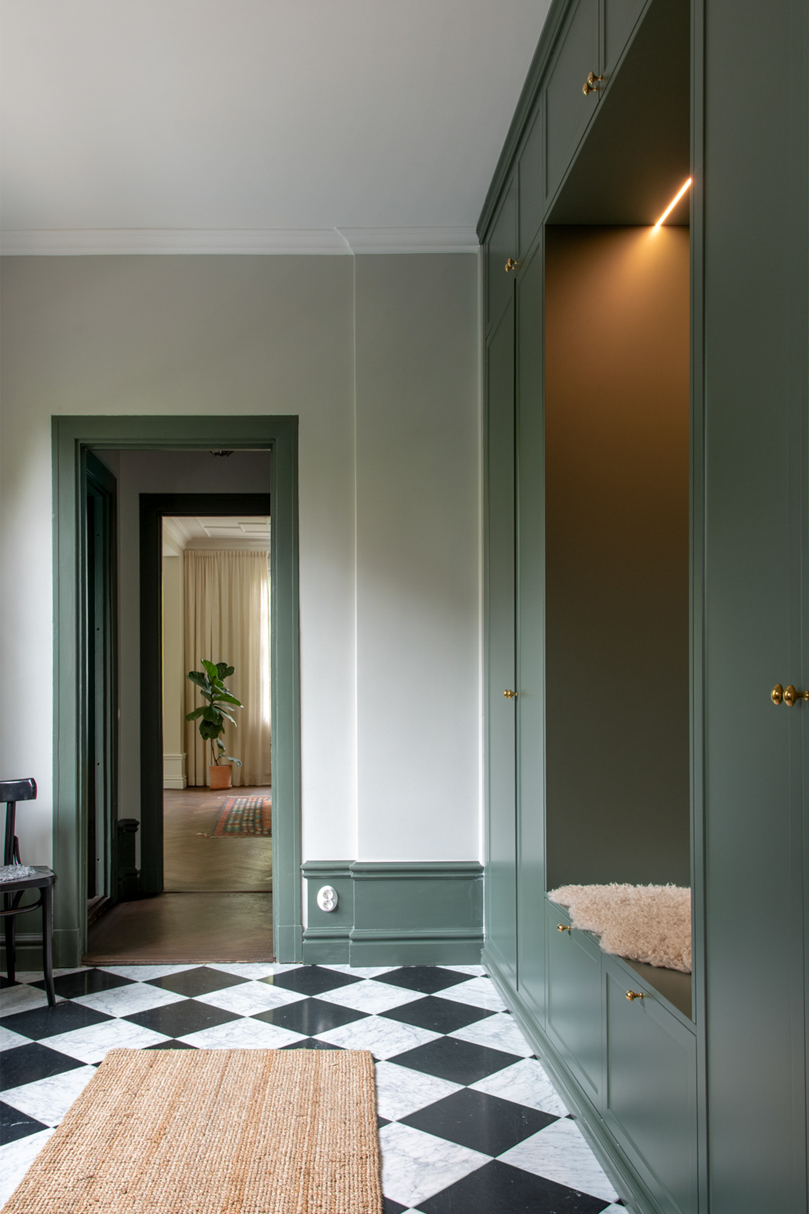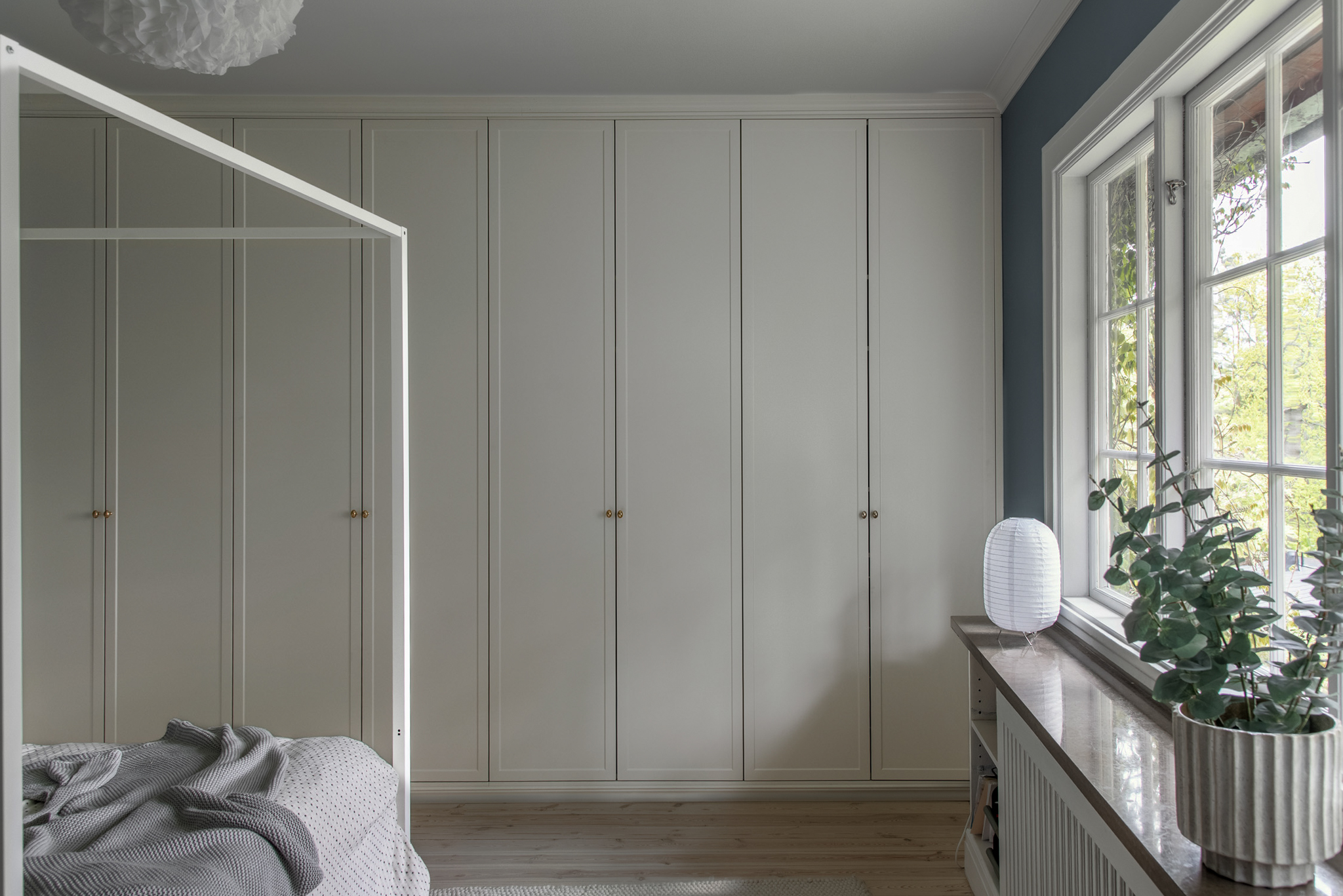 I hallen fortsätter formspråket med garderober byggda på IKEA PAX-stommar, anpassade för att ge smart och stilren förvaring.