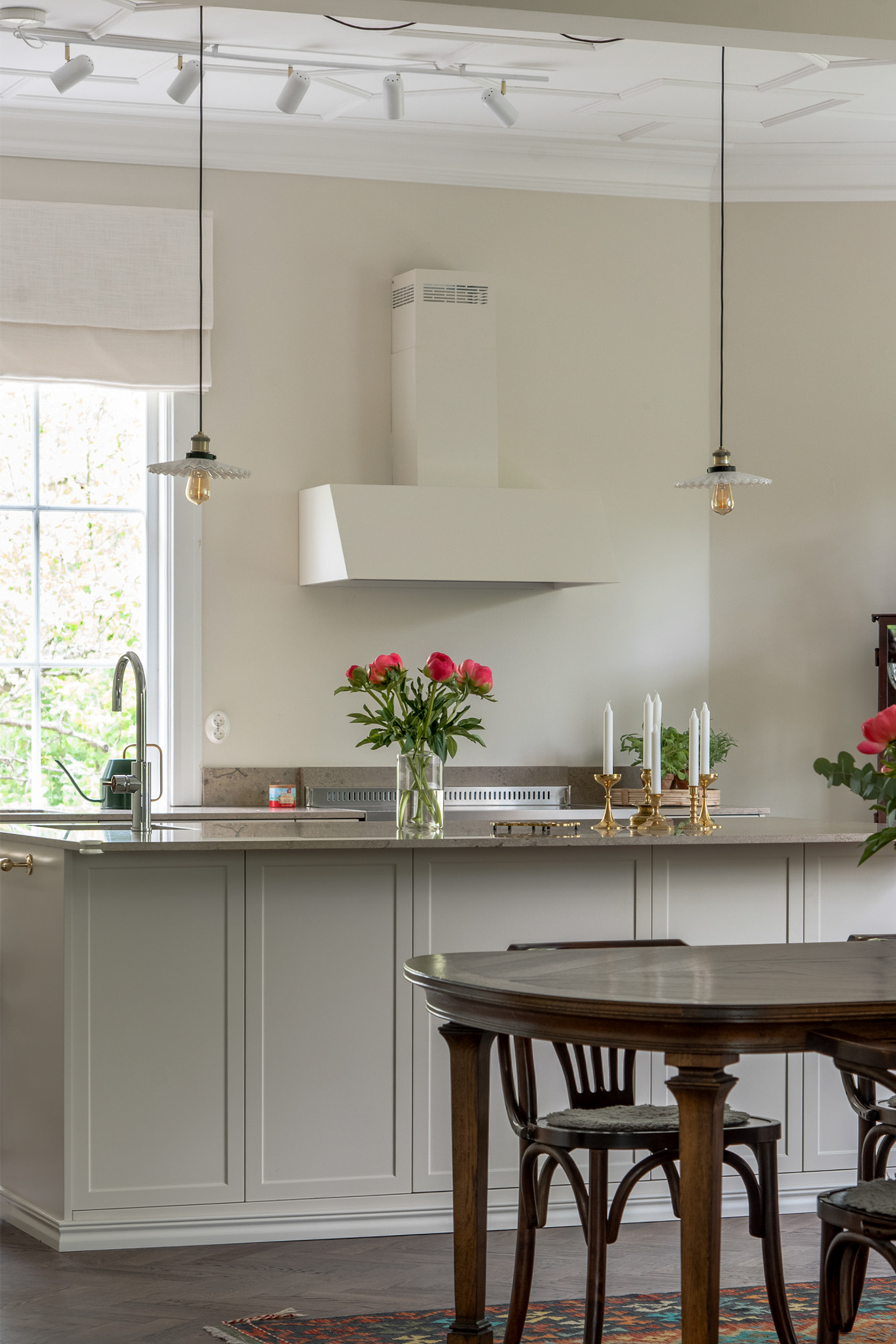 Det som en gång var sömmerskans rum har nu öppnats upp och formats till ett luftigt kök med plats för både vardag och sociala tillställningar.